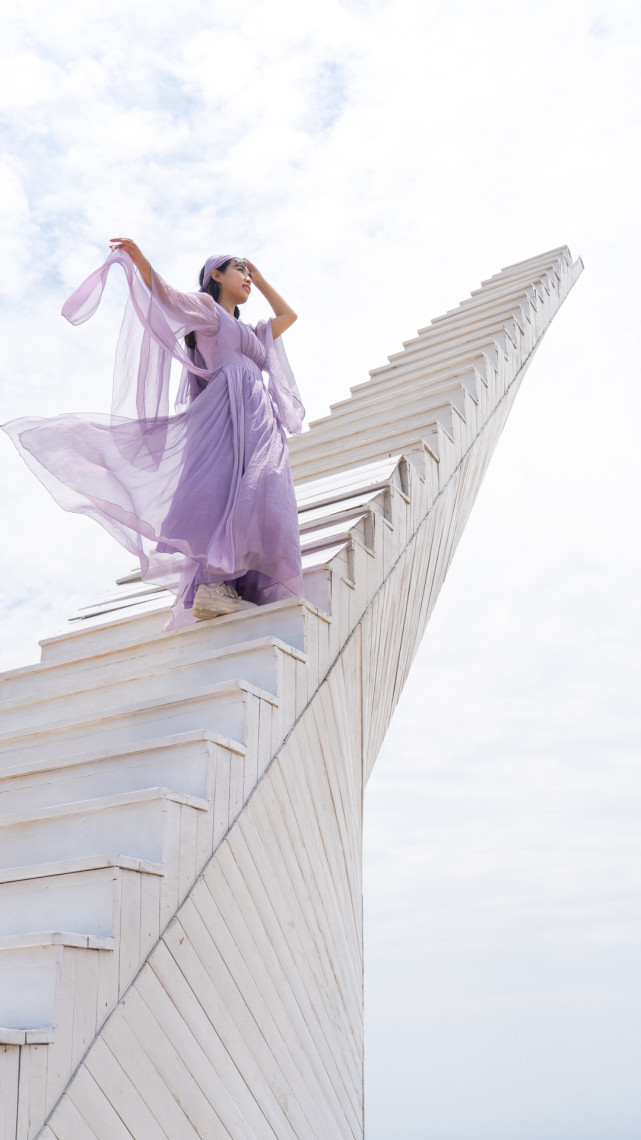 看名字我真的无法想象设计师是怎么来设计这天梯的。走到梯前,发现梯子通体白色,目测成60°坡面伸向天空,随着台阶高度变窄,看起来很是惊险,体验者需要胆量。