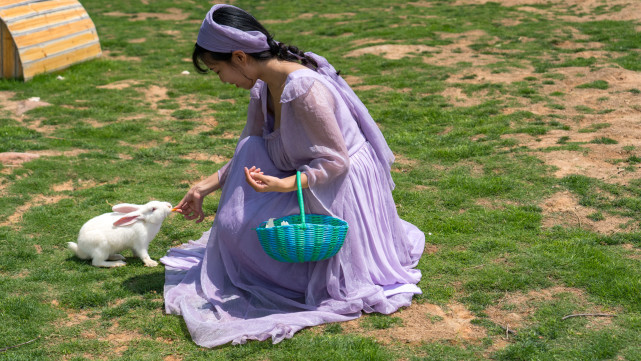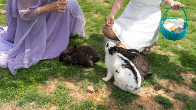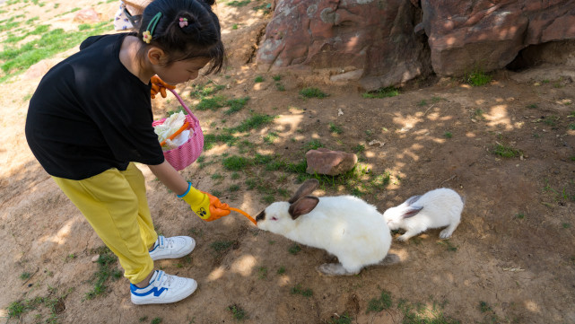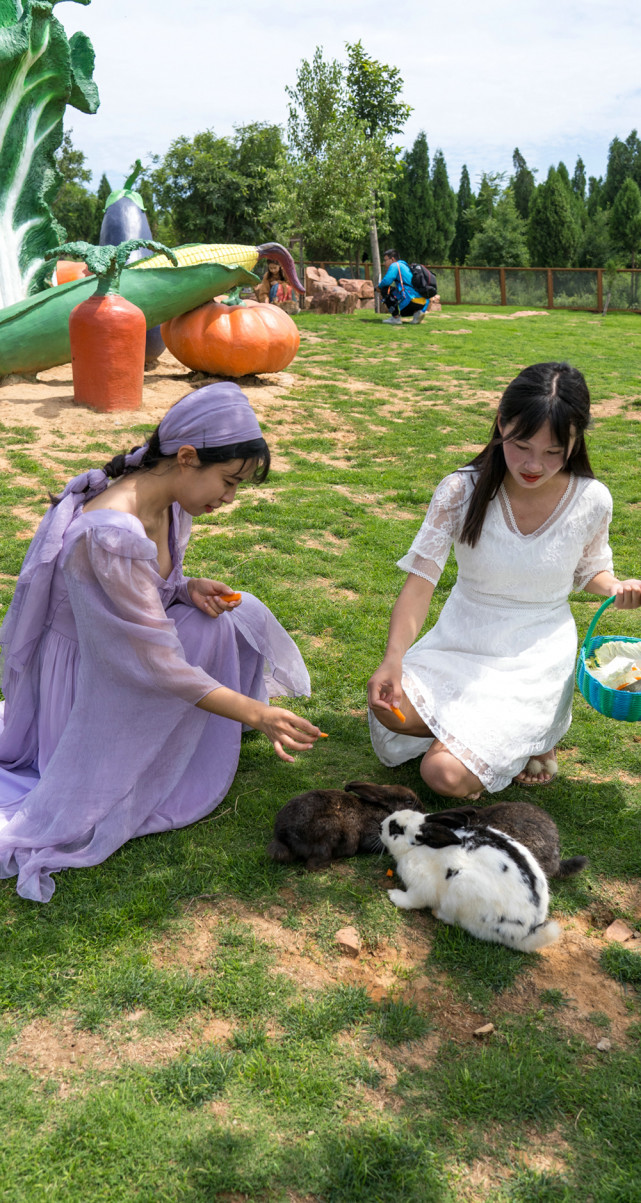 圈起来的草坪里有各种颜色大大小小的兔子,游客们可以购买大白菜胡萝卜等小兔爱吃的美食喂它们,亲手摸摸这些家伙。