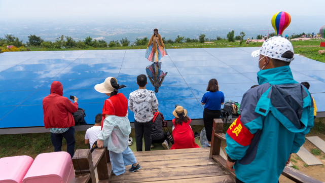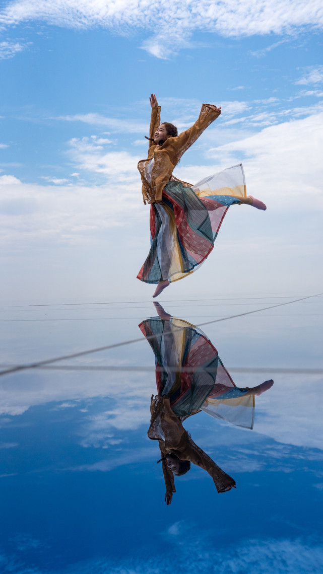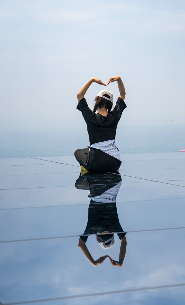 这是每个来云上牧场的游客必打卡地方,这里其实是一面巨大镜子,天好时,人站在上面,倒映着蓝天白云,随便一张手机照,都能呈现出梦幻风格。
