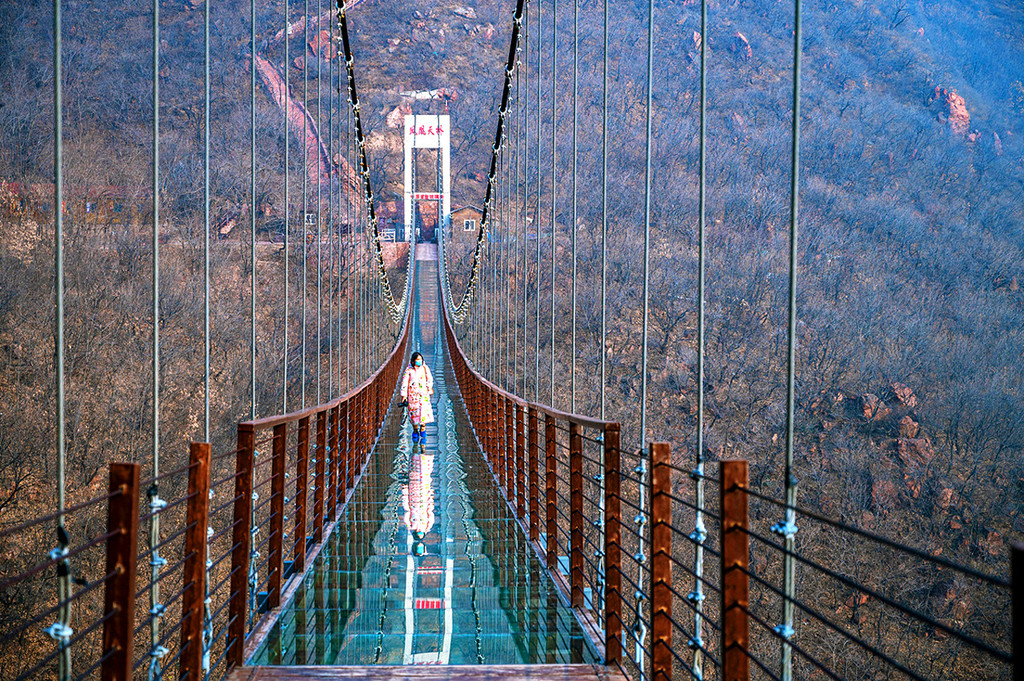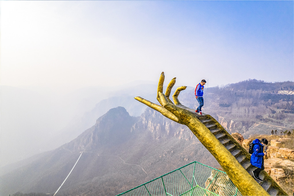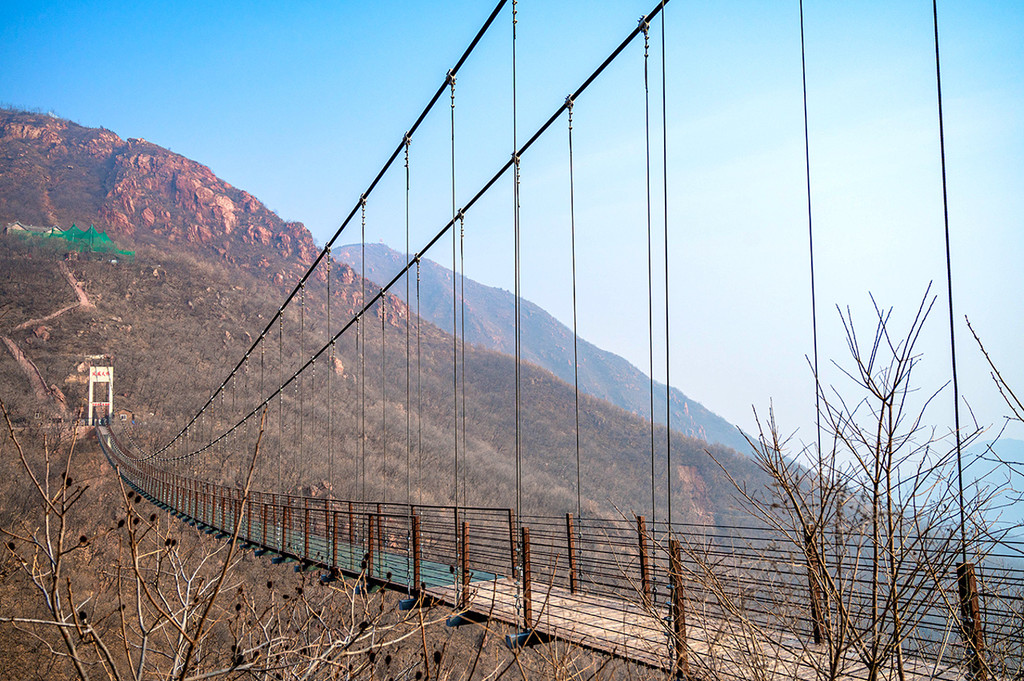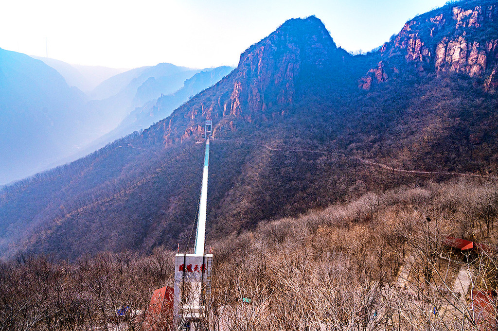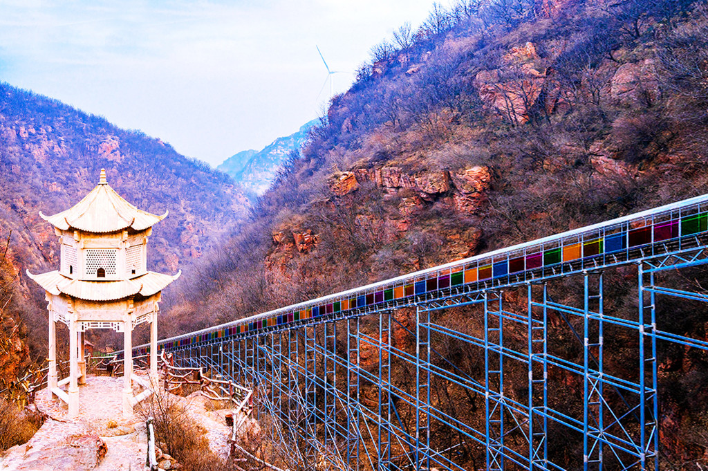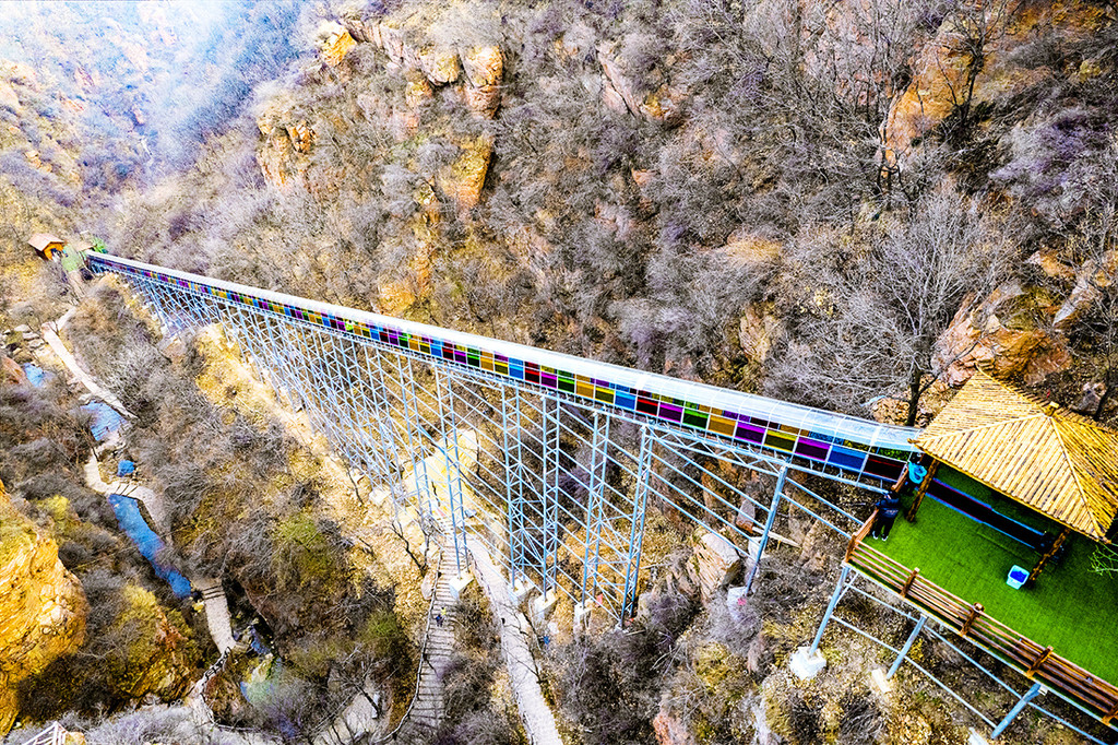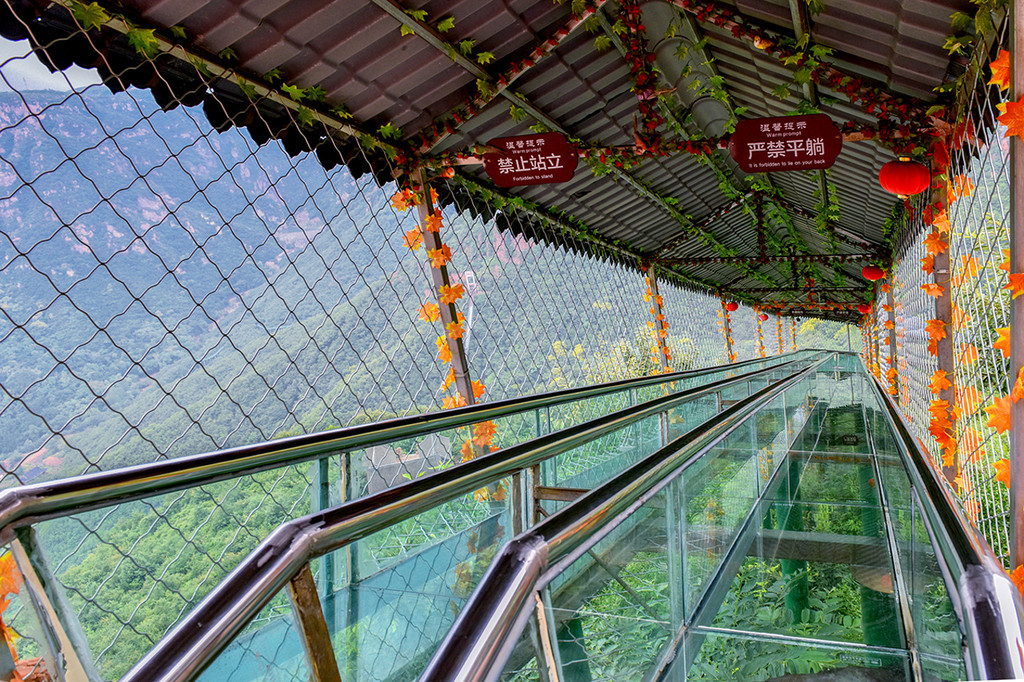 比方说凤凰天桥,这是整个中原地区第一条悬索玻璃吊桥,它是郑州超一级网红,也是整个河南景区里的标志性热门项目。整座悬索玻璃吊桥全长有210米,桥两端,一边是玫瑰岭,一边是栖凤峪, 桥身是钢筋悬索,桥面则采用的高强度钢化玻璃铺设,透通性非常之好,走在桥面上,山谷全在脚下,那感觉,有点爽又有点脚软。