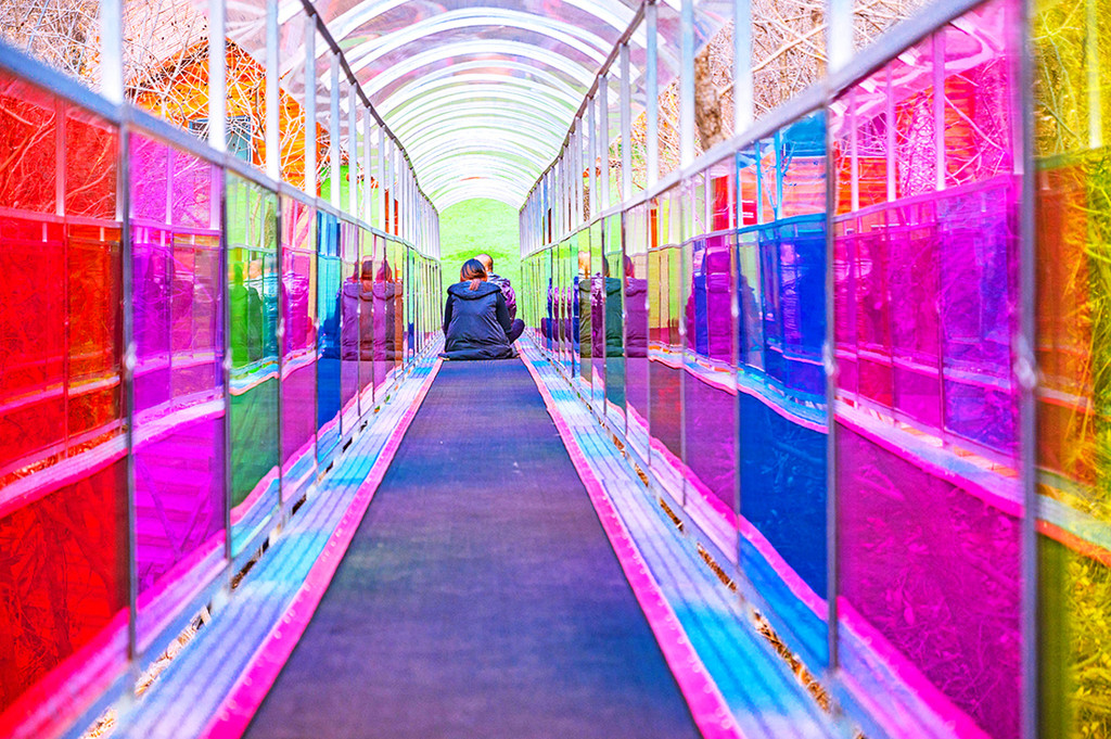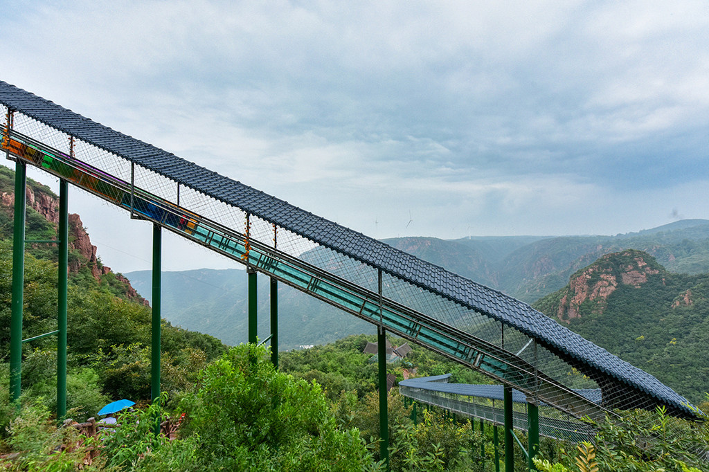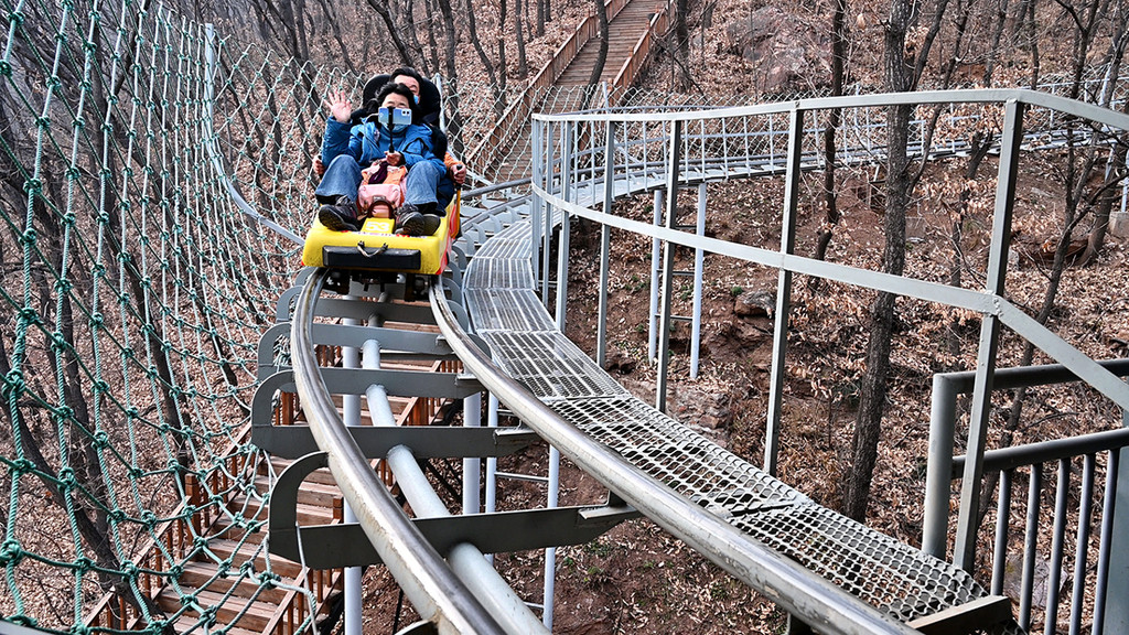 还有整个依山而建,蜿蜒铺设在山林之间的管道式滑道丛林飞跃。在滑道上,从山腰滑到山底,全长1988米,整个过程却只有5分钟,是真正的、现实版的山道“过山车”没错了。