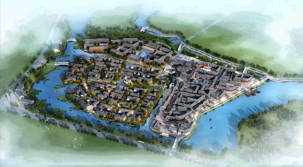 行宫建筑群,布局严整,规模宏大,轴线分明,左右对称,气势磅礴,雄伟壮观。最上端即为京杭大运河。