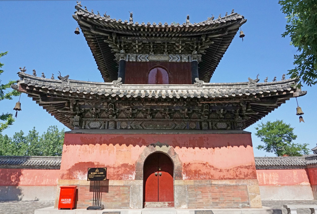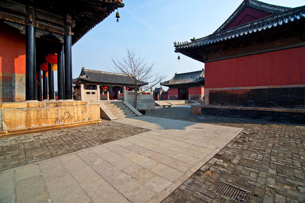 在第一进院落内的钟楼,对面西侧为鼓楼,正中间是碑亭。