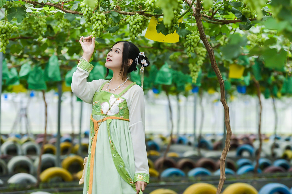在种满各种品类的葡萄藤蔓的大棚里穿梭,一边采摘葡萄,还时不时往嘴里塞个一两颗,鲜美多汁,是沁人心脾的甜。