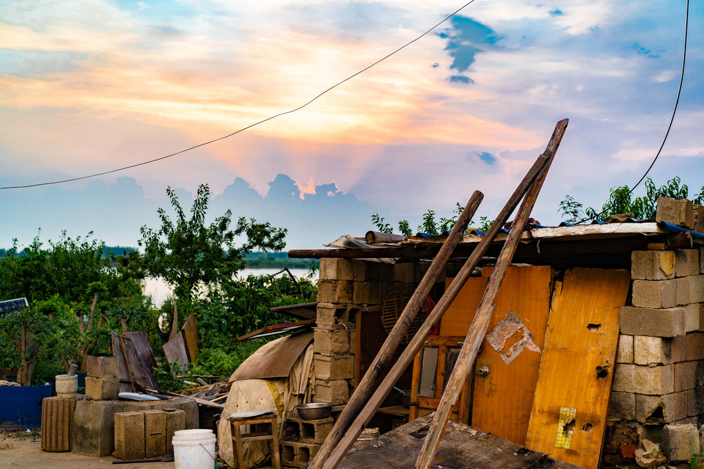 大概是开到一个路口,四面宽阔,远处就是即将日落的太阳。我们往里面走了走,发现是一户渔民的家,门口有只大白鹅嘎嘎嘎的叫着走过来,还有只小小的熊猫兔不顾一切的啃着草。大姐打着招呼从屋中走出来,知道我们想拍照后就热情邀请去后面小土岸了!再往里走就到了人家家后院,一片延伸向湖面的土岸…
