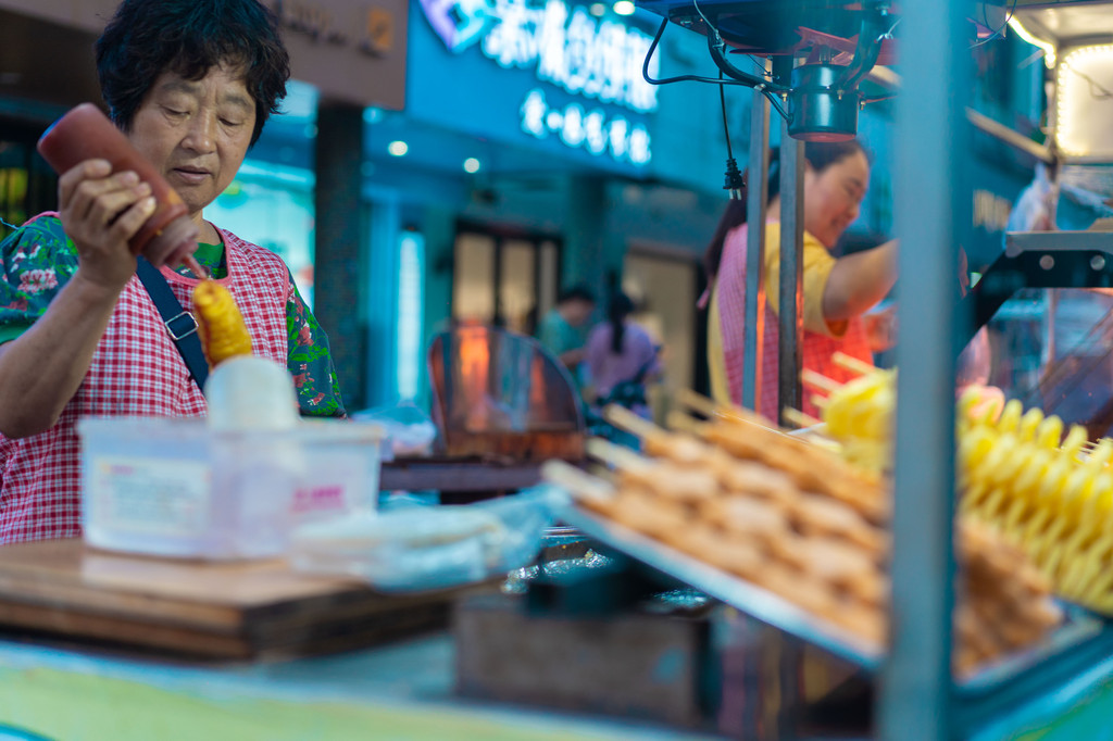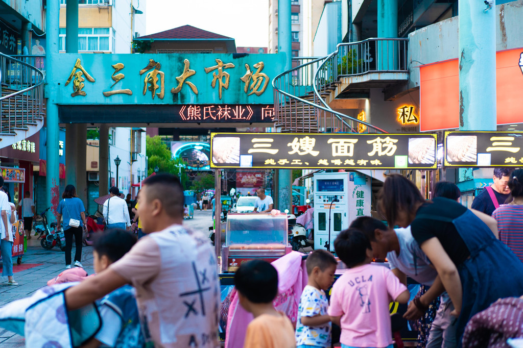 傍晚差不多6、7点的时候去金三角步行街,这里算是新沂最早的城市心脏了,老城区商业街依旧繁华,随着小摊主越来越多,夜市的灯光渐渐亮起,人潮涌动,很多年轻人,还有带小朋友的家庭一起来逛吃逛吃。