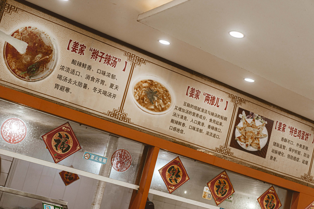 上有家「姜家辫子辣汤」特别火,从清朝光绪年间就创办的老字号。而且一到7、8点人多到座位都抢不到。所以我早早的6点冒着雨就到人家店门口守着等开张!