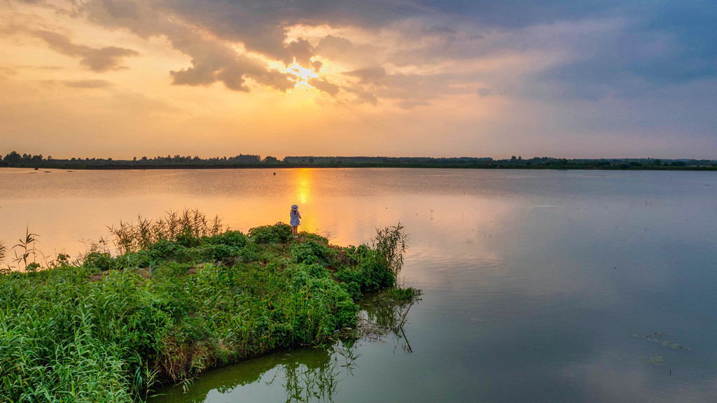 夕阳的影子在湖面渐渐拉长,一道金光倒影在其上,云朵中偶尔会有鸟儿成群飞过…