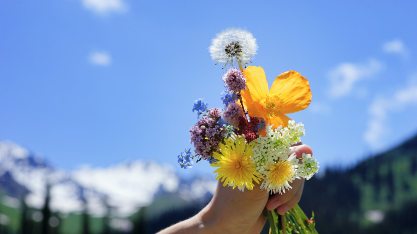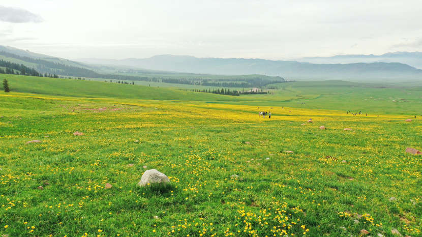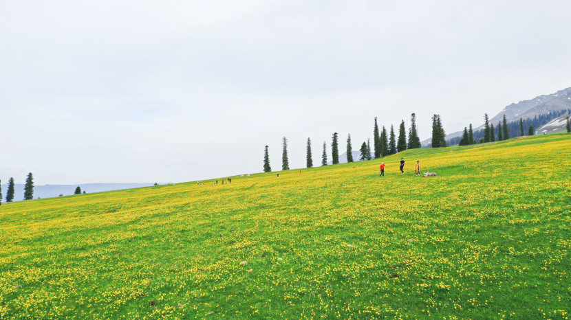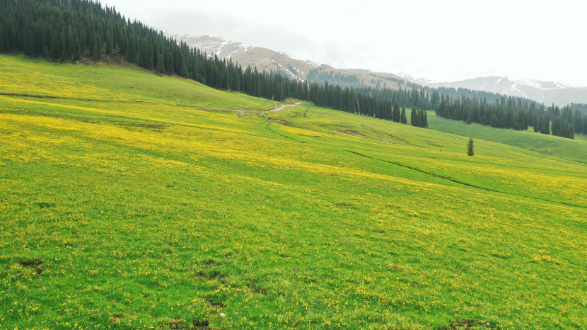 其实,空中草原的花海就没有断过,随着天山林海的冰雪逐渐融化,白的、紫的、黄的、蓝的……还有轻盈的蒲公英,五颜六色的花朵们,还有悠闲吃草的牛羊们,总是不吝讲自己的美丽,展现在尘世。