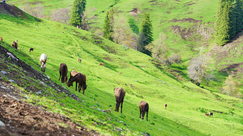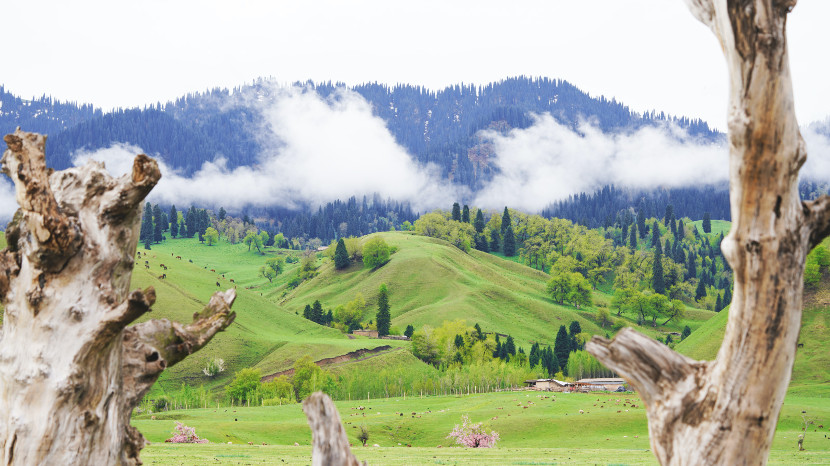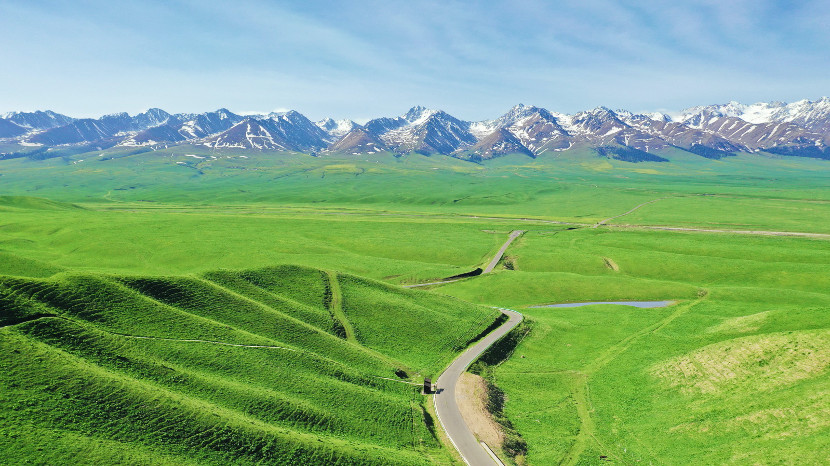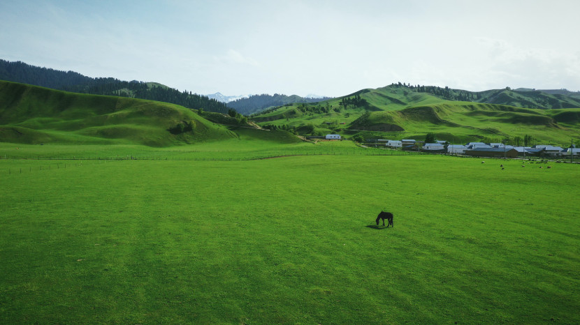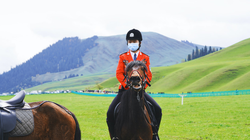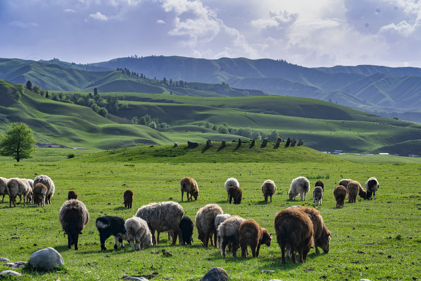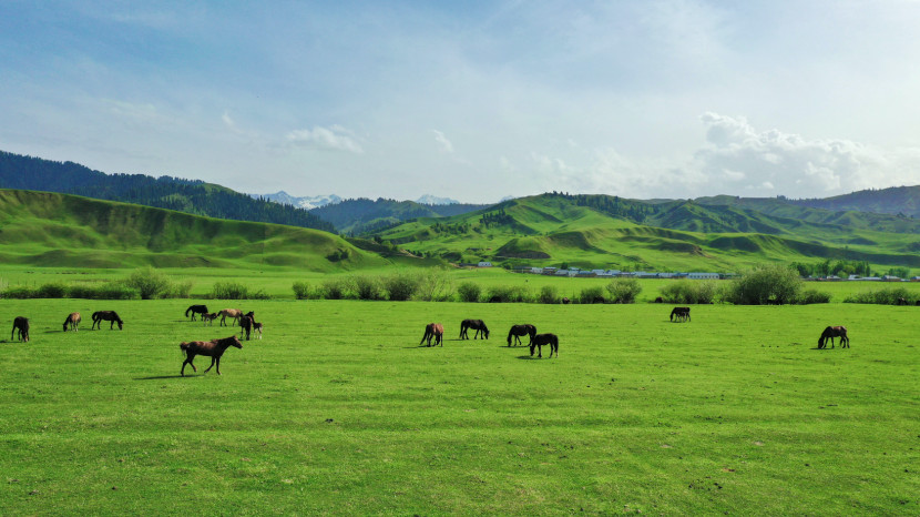 草地上,牛羊成群,马儿欢腾,一派田园盛景。这些都是当地哈萨克牧民饲养的。