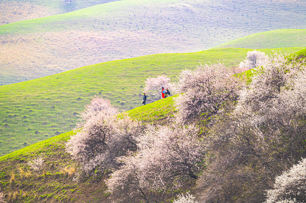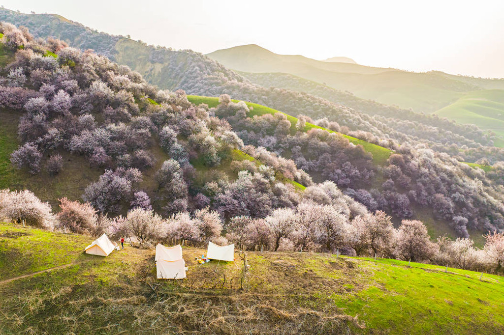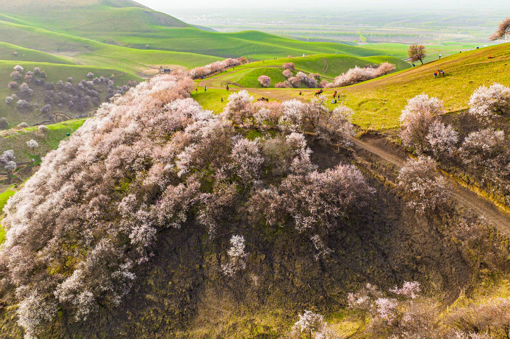 这里就是50元骑马到达的一块平坝,是最近的一个点,可以看到四周的山峦上开满了杏花,视野开阔,三面环山,一面是新源县城的方向,如果你不想走,就可以在这里慢慢地玩。