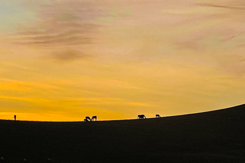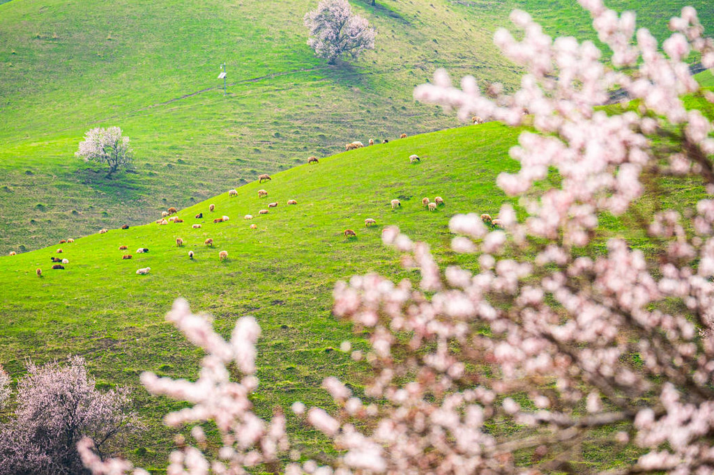 到达的时候是黄昏,景区已关闭,山坡上牛羊还在吃草。从伊宁过来走高速大约要3个小时,导航吐尔根杏花沟, 景区前有一个营地,有免费核酸,也可以住在新源县城,开车半个多小时。