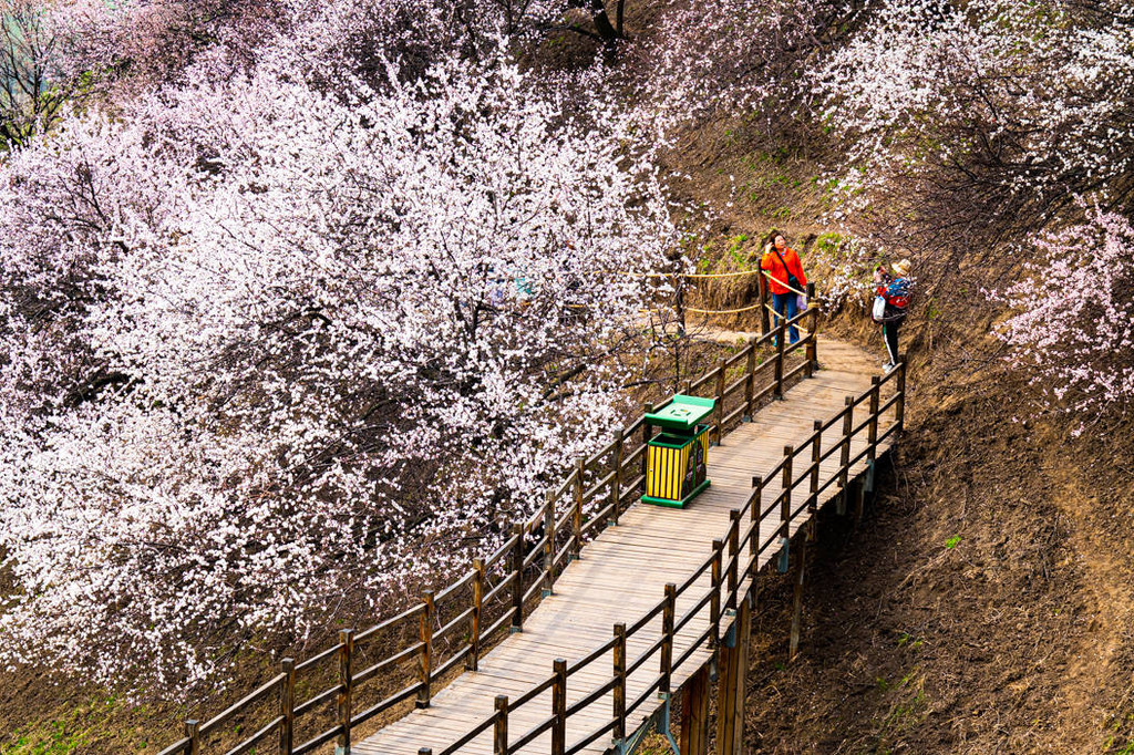 杏花在日出后1到2个小时形成极佳的层次效果,遍布一个个山坡,漫山遍野,姹紫嫣红。