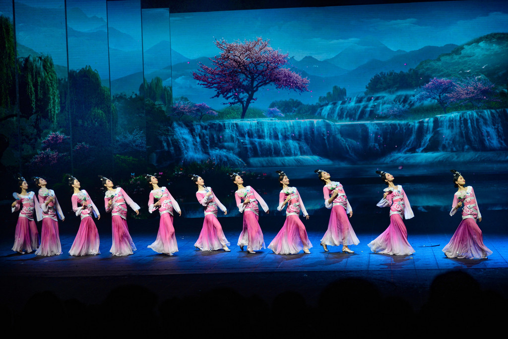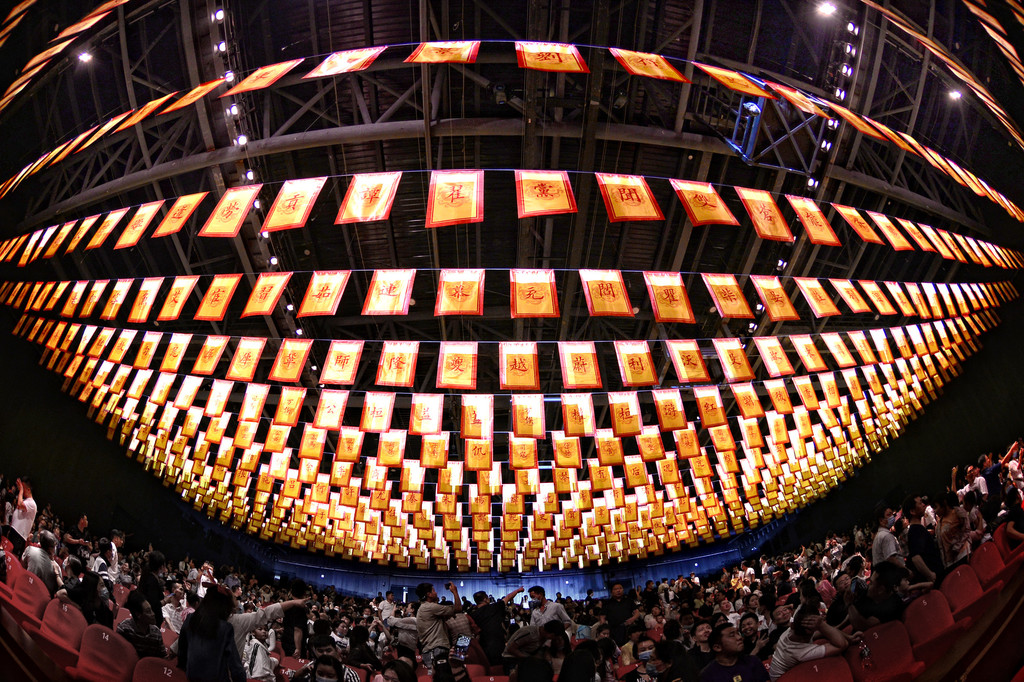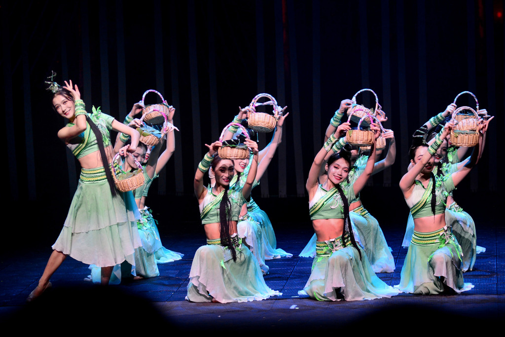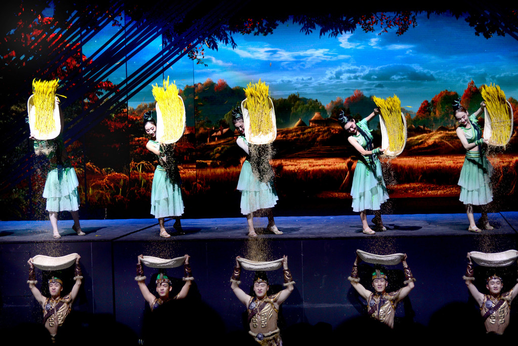 一队演员提着果篮穿过观众席飘向舞台,鲜明的五彩线条代表着纺织,演员手中的谷草代表着耕种。表述了轩辕黄帝播百谷草木、始制衣冠、建舟车、制音律、作《黄帝内经》的史实。