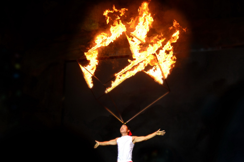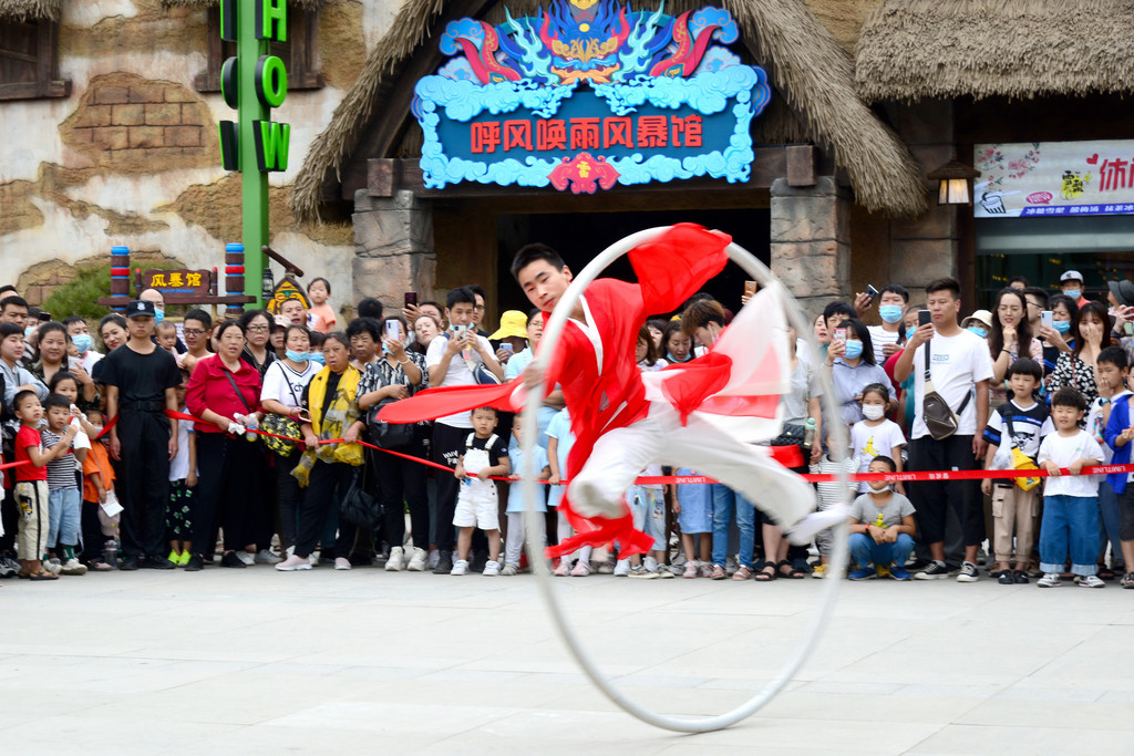 千古情广场上,杂技演员在一个大铁环上表演腾跃、翻滚等高难度的动作,他应用自如的驾驭着铁环犹如《风驰电擎》。