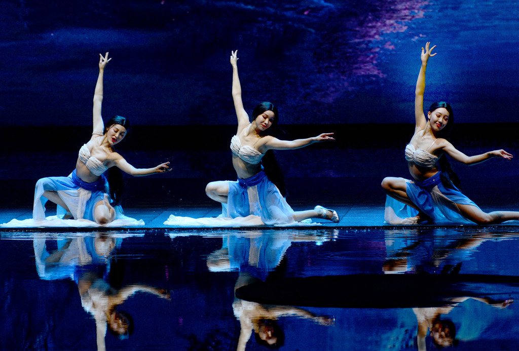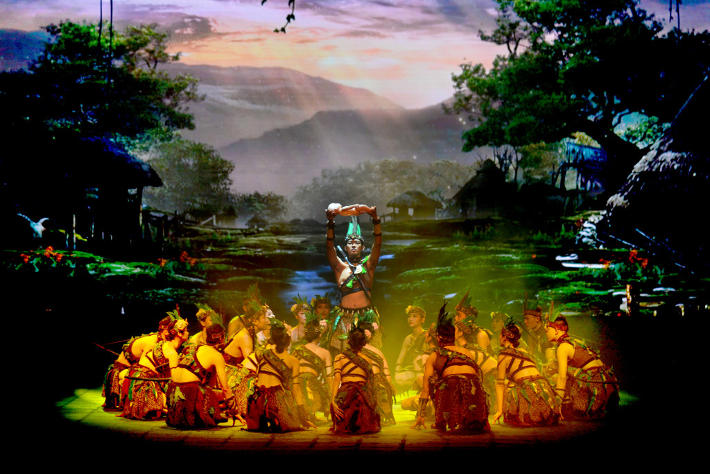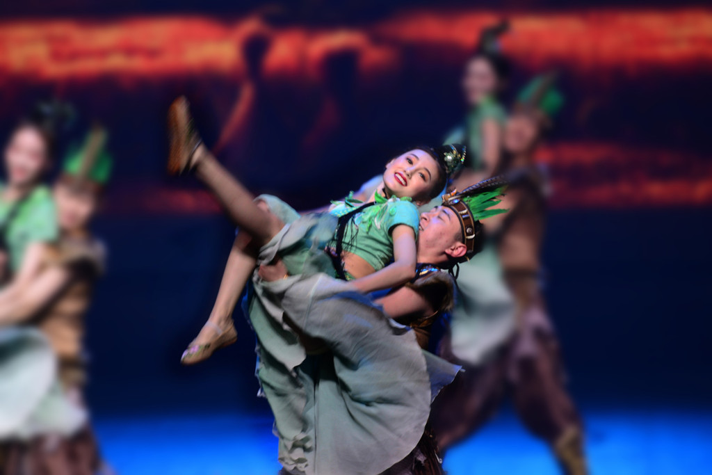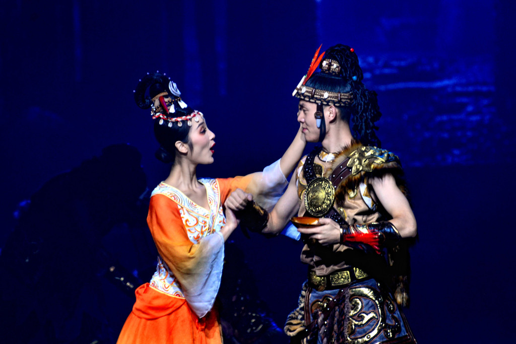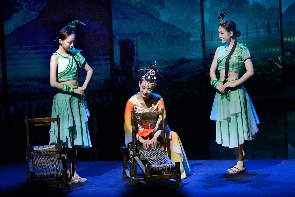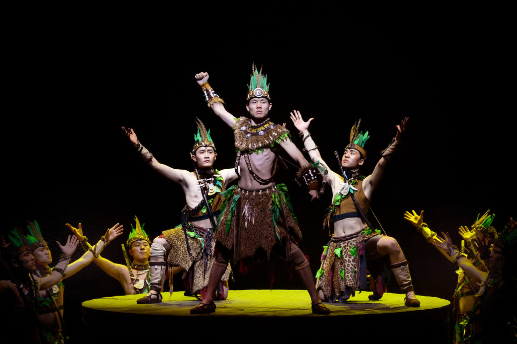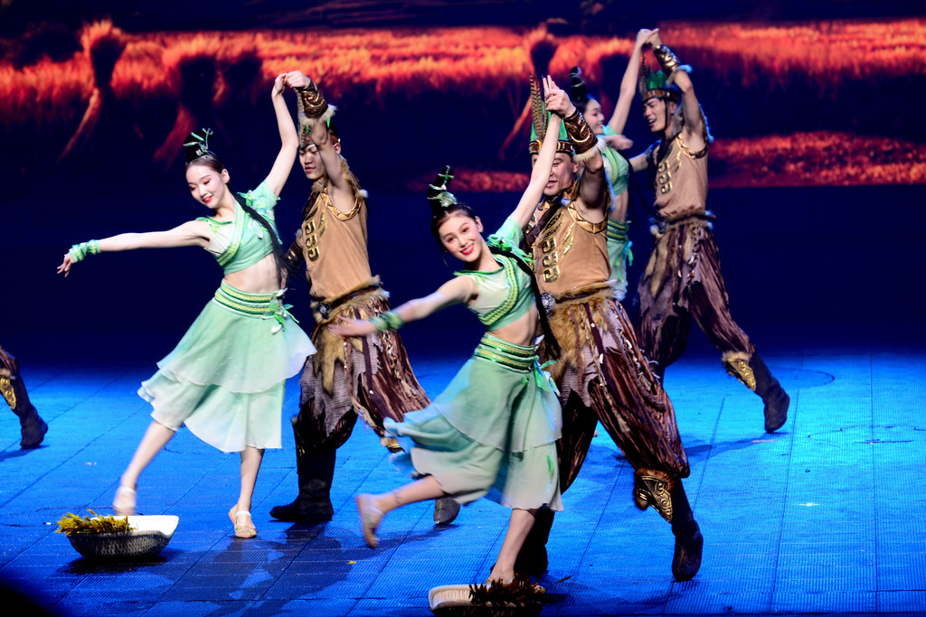 第二幕《轩辕与嫘》是一场唯美的表演,演员们通过鲜明的舞蹈语汇和细腻的形体表演,再现了轩辕黄帝、嫘和先民们男欢女爱、男耕女织的故事。