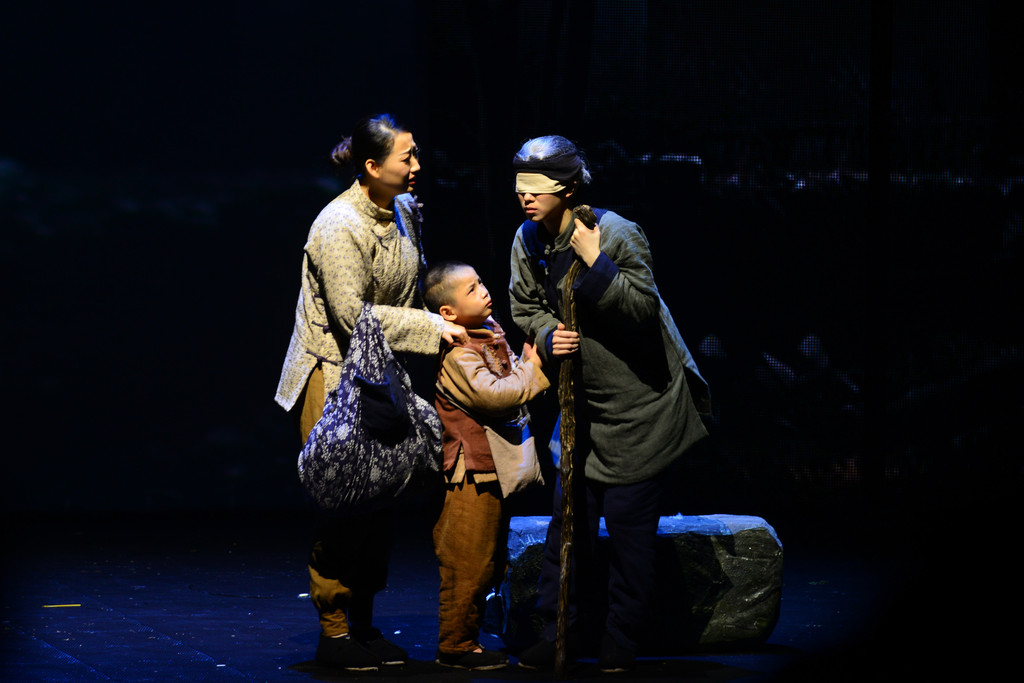 给我印象最深的是第五场《老家河南》,再现了八十多年前河南人民抗灾、抗战艰苦卓绝的场景。幕启,大灾荒年代,主人翁“豆儿”告别年迈失明的奶奶出去逃荒;老地主在给将要出去逃荒的少东家、少奶奶分仅有的十斤小米:“三斤你们带着,七斤我去交军粮”;“俺饿死了这地还在,兵要是饿死了,这国就亡了”!多么淳朴的爱国思想啊!忍不住的热泪无息的流淌下来。