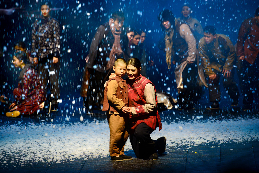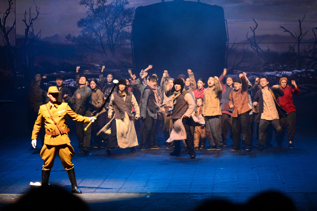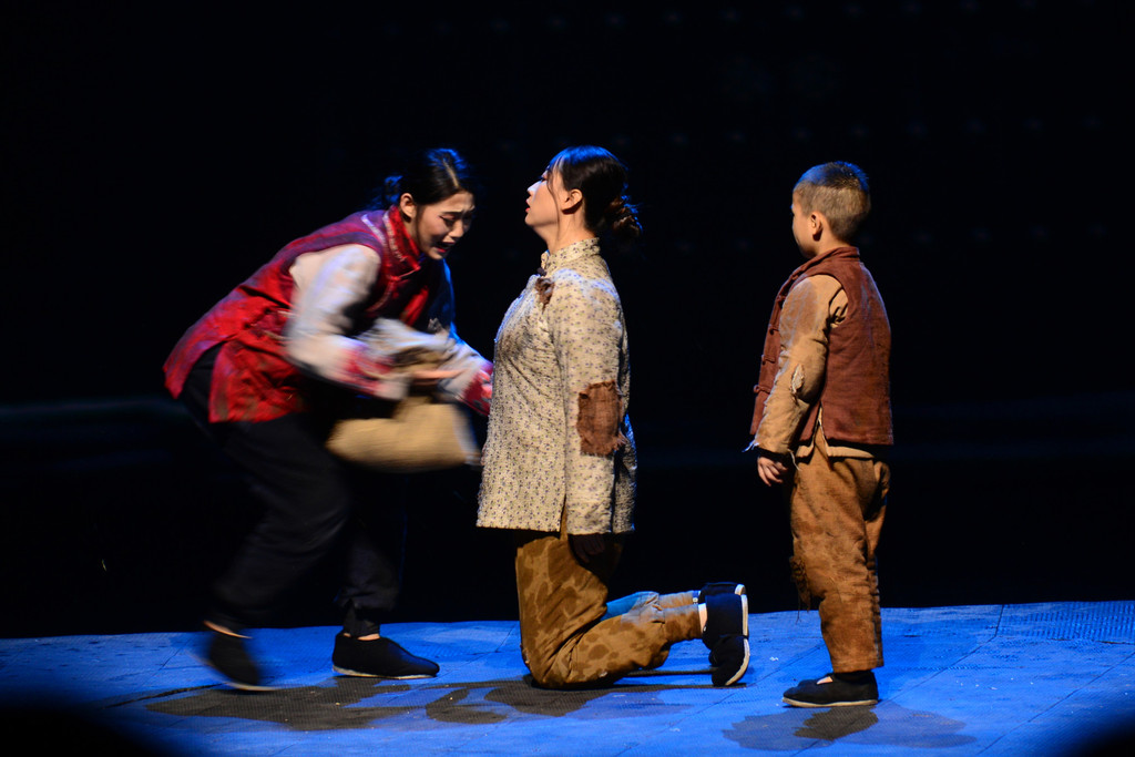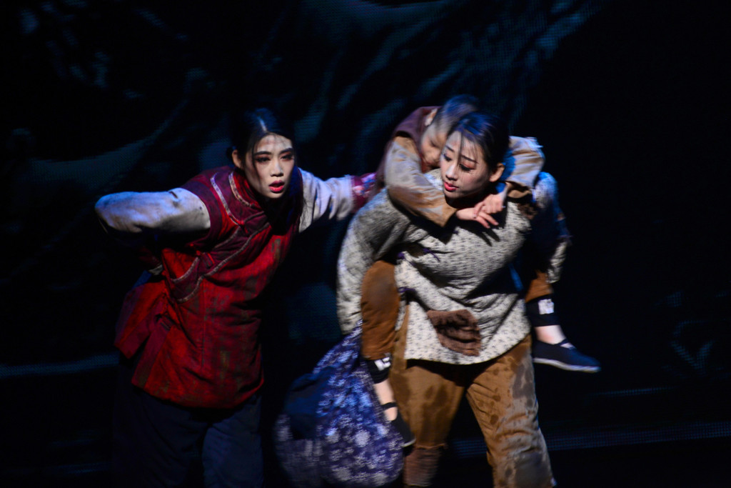 故事围绕着少东家夫妻和“豆儿”母女展开,逃难路上少东家为掩护豆儿被日军飞机的炸弹炸死;豆儿的妈妈为了给将要饿死的孩子换口吃的自卖其身;怀有身孕的少奶奶和群众一起抗争日寇的镇压,为了保护豆儿被日军枪杀.....满满的血海深仇啊!舞台上的悲壮和压抑使人沉重的透不过气来,泪水始终模糊住我的双眼。