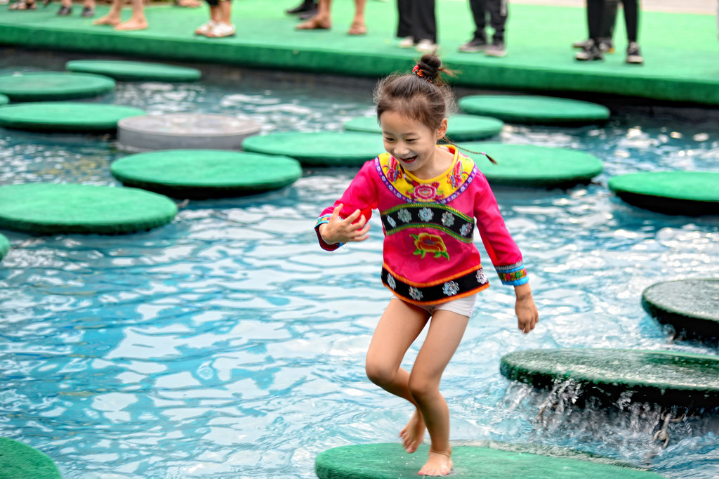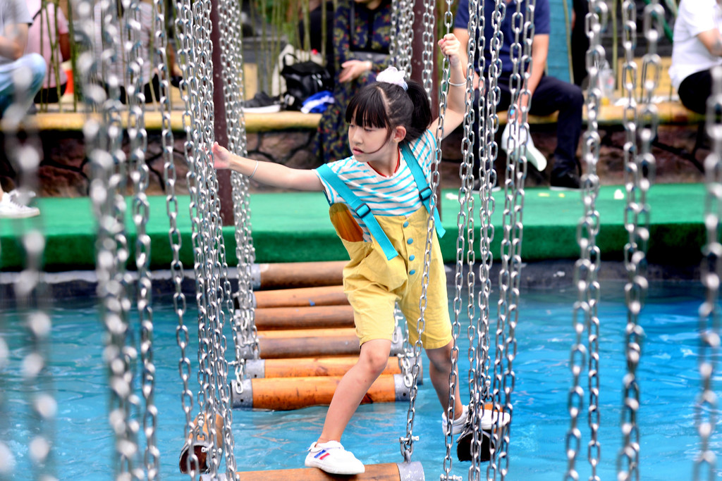戏水池边围满看热闹的人,这里是孩子们的最爱,面对着水面上的浮桥、铁索吊桥跃跃欲试。穿红衣的小姑娘就像一只小飞燕,轻盈的在浮桥上掠来掠去,不过更多的孩子都是翻落水中,引来一片笑声。