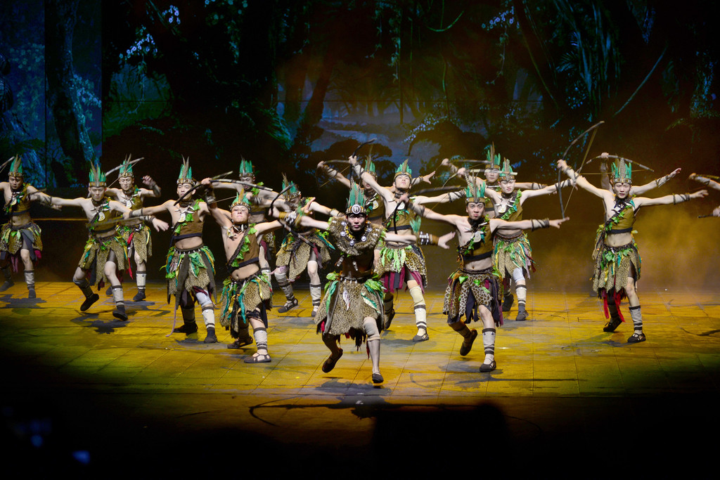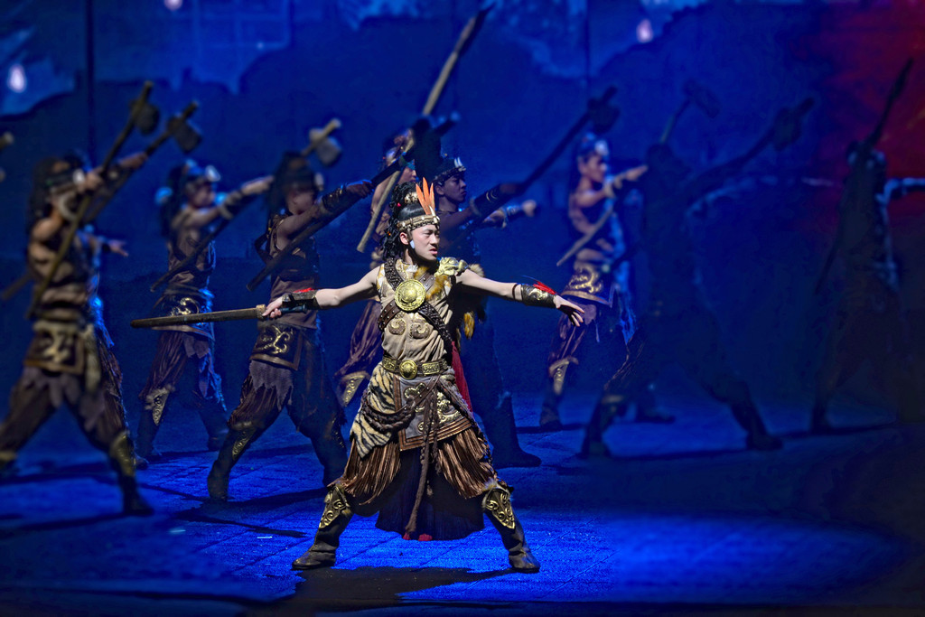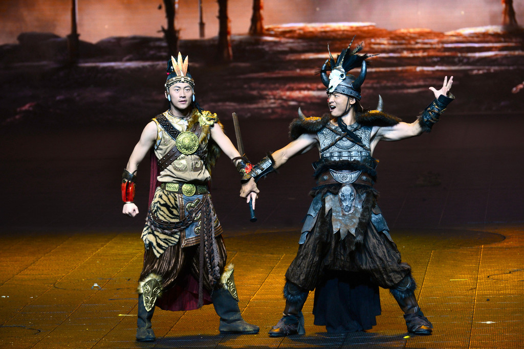 追光灯亮起,随着“豆儿”老人的娓娓叙说,中华五千年文明历史拉开帷幕。第一幕《龙的传人》远古的中原大地上轩辕黄帝降临世间,带领族人狩猎、耕种,生生不息。