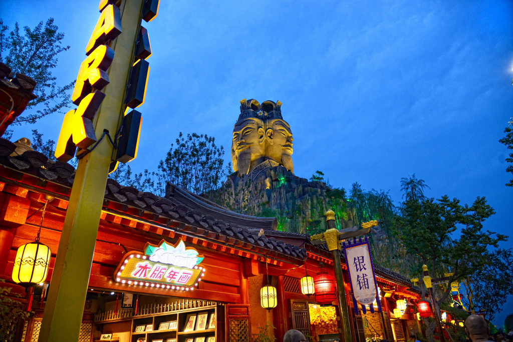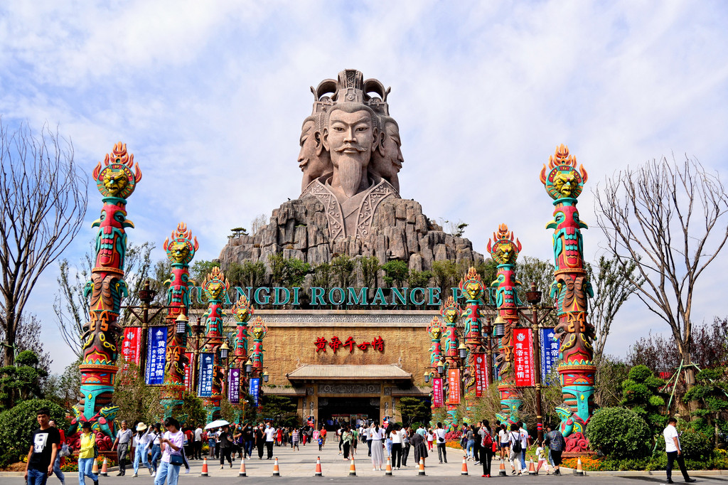 离开剧院,平复一下澎湃的心绪,徜徉在《黄帝千古情》景区的风花、雪月街头,满满的古风古韵尽入眼底。轩辕黄帝的巨大四面雕像耸立园中,八方游客纷至沓来,街边商铺林立,演艺广场人头攒动,各种演艺你方唱罢我登场,令人目不暇接!