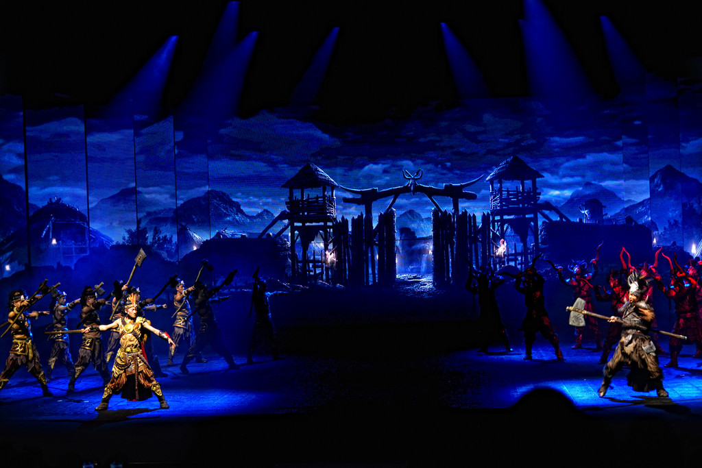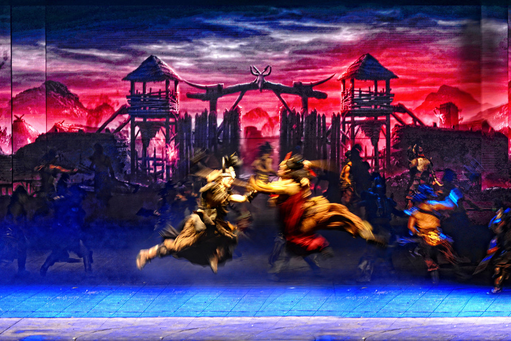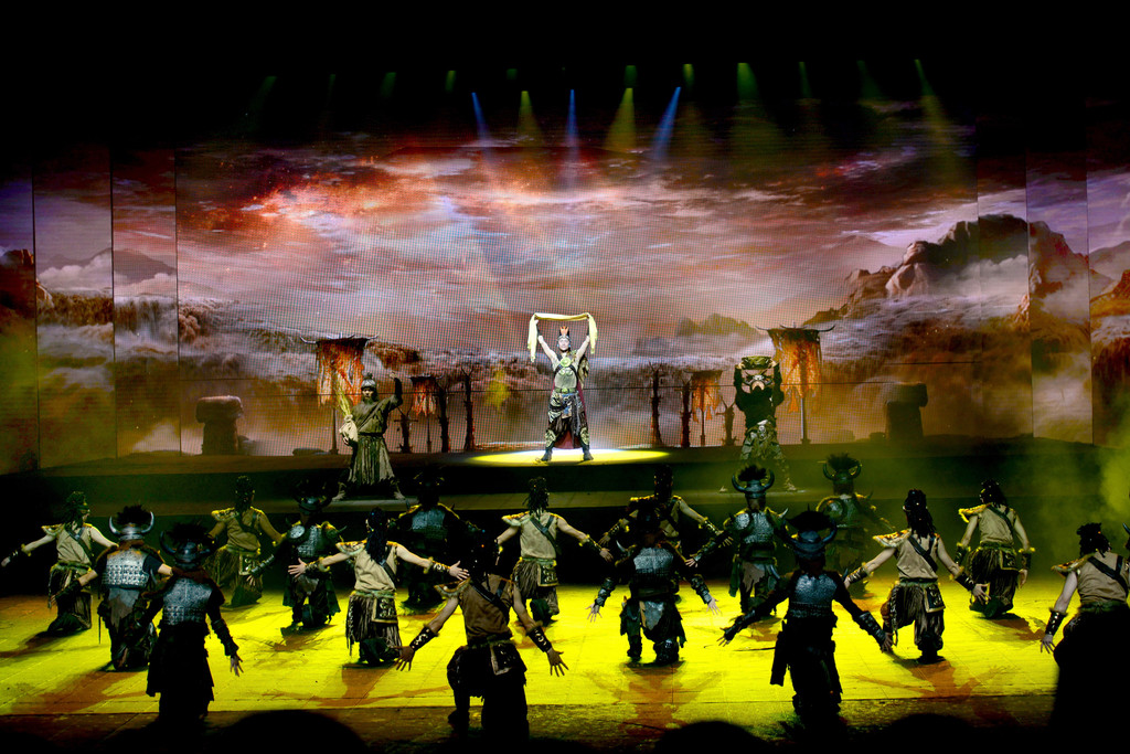 懵然间,滔滔黄水从舞台上轰鸣着倾泻下来,杂技演员在滔天黄水之上表演着绳技,展现了轩辕黄帝带领族人与洪水搏斗,自强不息、开拓进取,创造华夏文明,达到天下大同的精神与思想,给人以强烈的视觉冲击力,令人叹为观止。