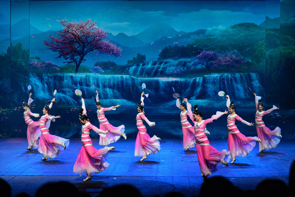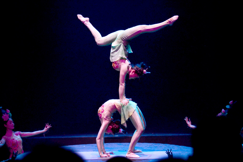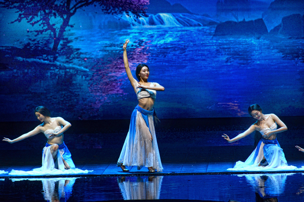 激烈的打斗之后是一场委婉的歌舞《郑国风韵》,执园绸扇的舞蹈演员手足间散发着郑国仕女妖娆的风姿,杂技演员的柔术体现了中原人坚韧挺拔的意志和精神。一段柔情的双人舞蹈激光秀在温馨的音乐中展现开来,赢得观众的阵阵喝彩。