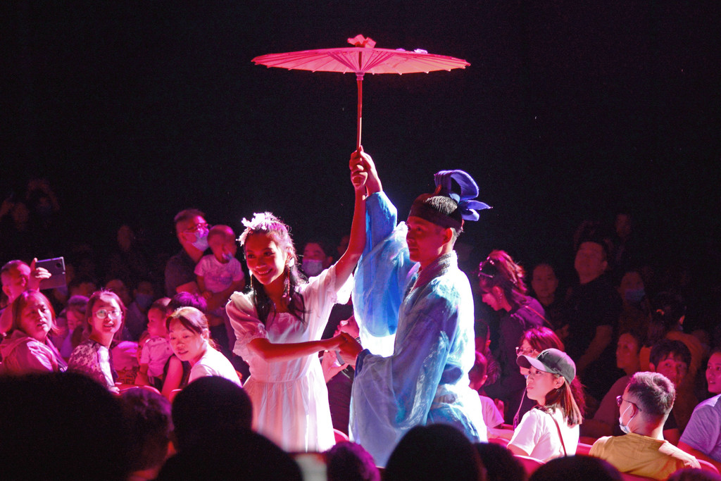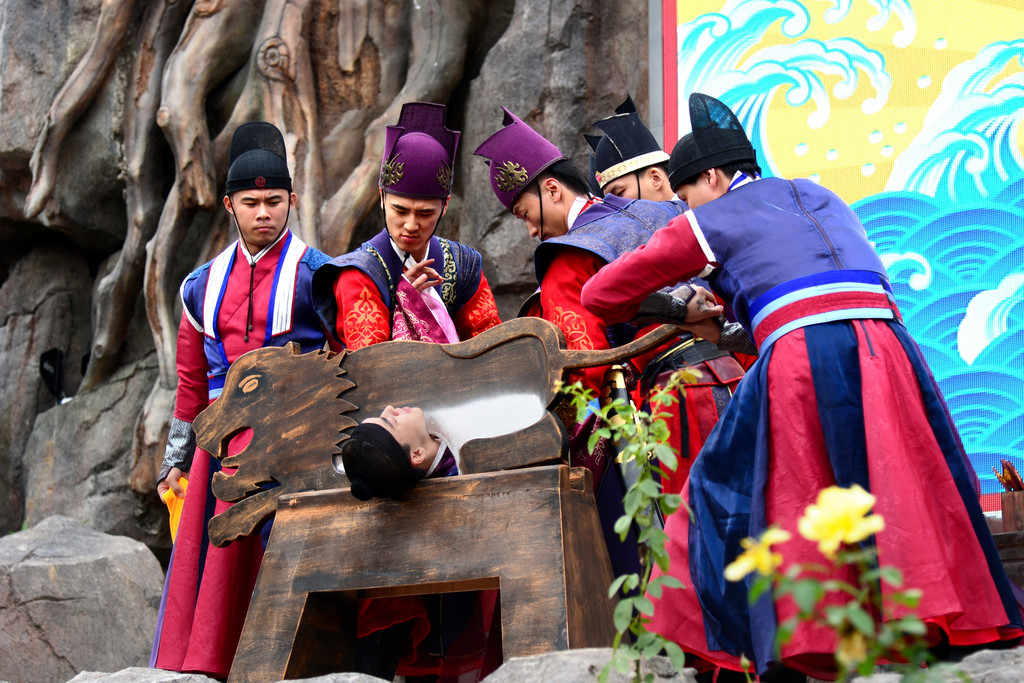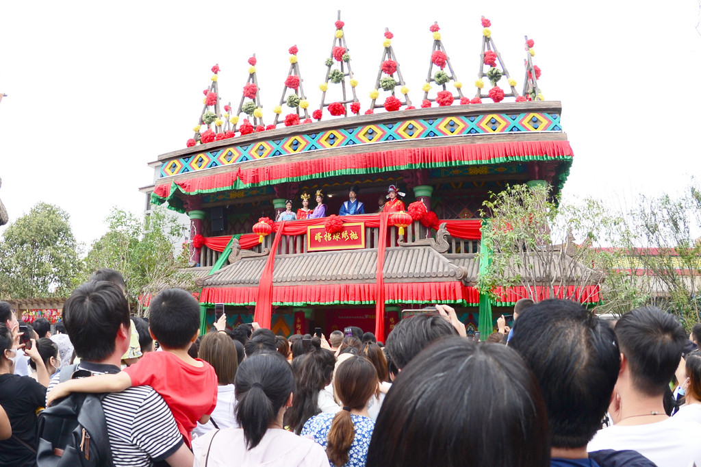 中心广场鼓乐齐鸣,包大人升堂《铡美案》开始了,这是一段耳熟能详的故事,演员们表演的认真,虎头铡落下时候观众叫好一片。