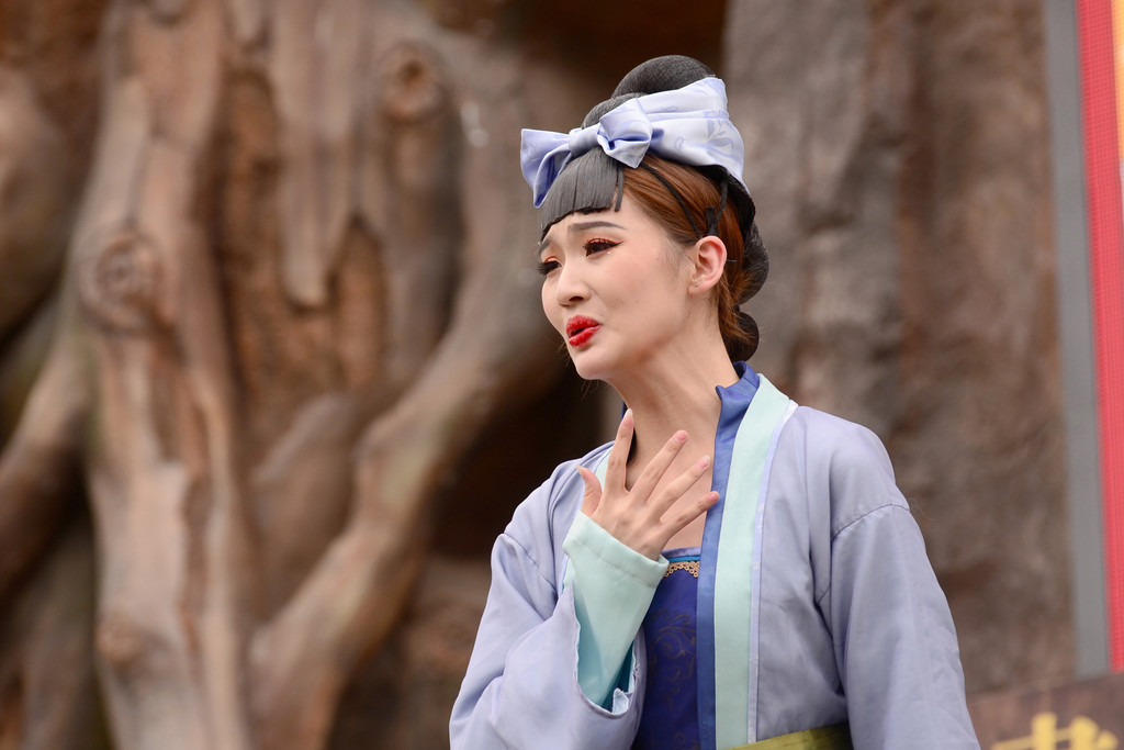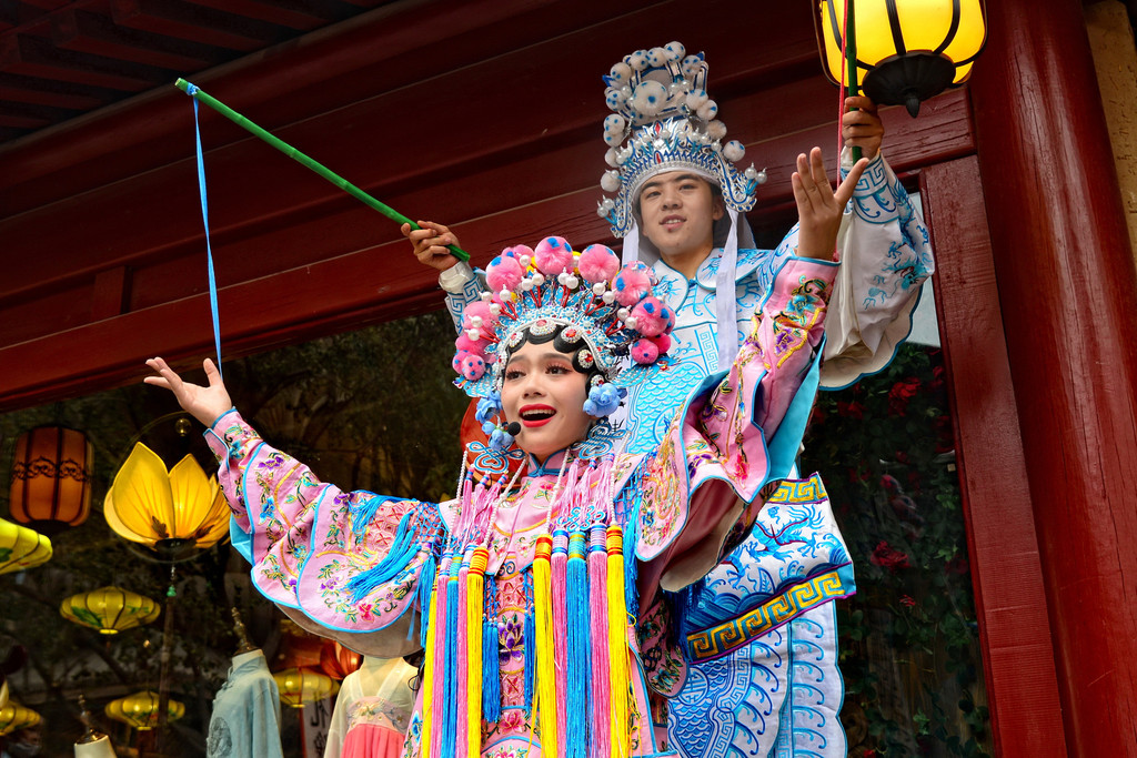 河南是豫剧的发源地,景区当然少不了豫剧。花木兰商铺前上演了《花木兰》,演员们别出心裁的采用了类似“提线木偶”的表演形式,一曲《谁说女子不如男》唱出了女子的豪杰。
