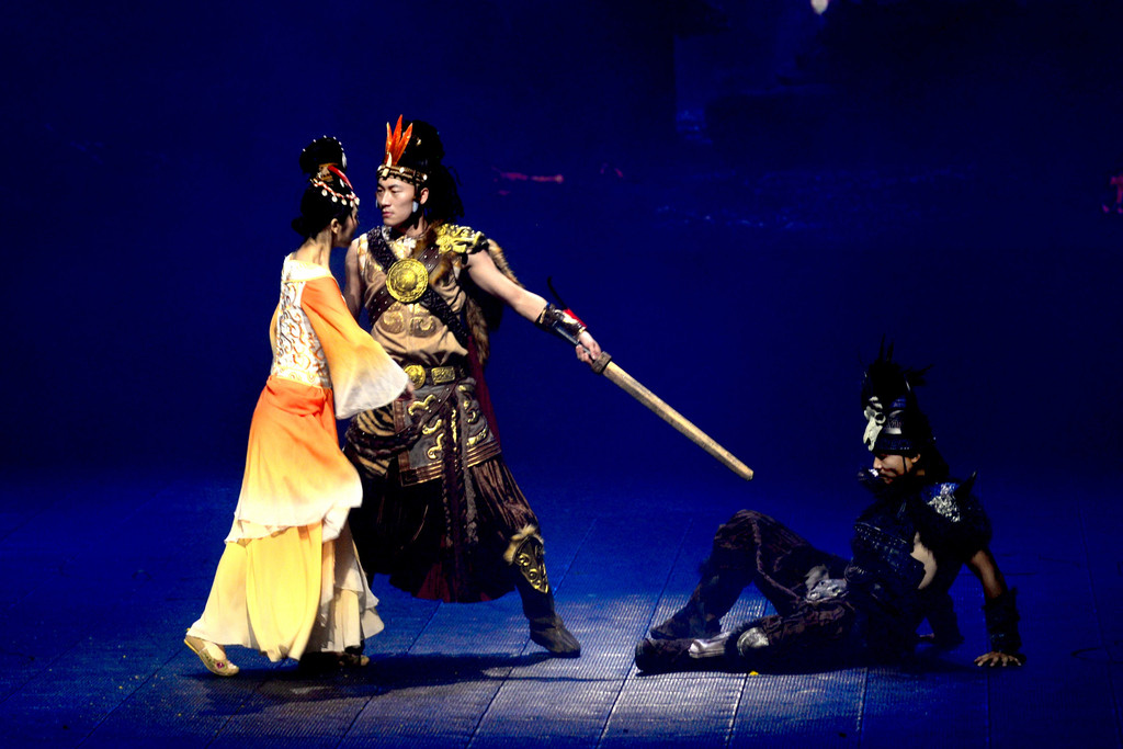 这段故事的结局有些新意:编导没有采用战国帛书所载黄帝杀死蚩尤“充其胃以鞠,使人执之,多中者赏”的传说,而是采用了《龙鱼河图》所记:“黄帝制服蚩尤,帝因使之主兵,以制八方”。舞台上的嫘劝说黄帝赦免蚩尤并重用他,以期天下大同。这皆大欢喜,符合民族大团结的精神。