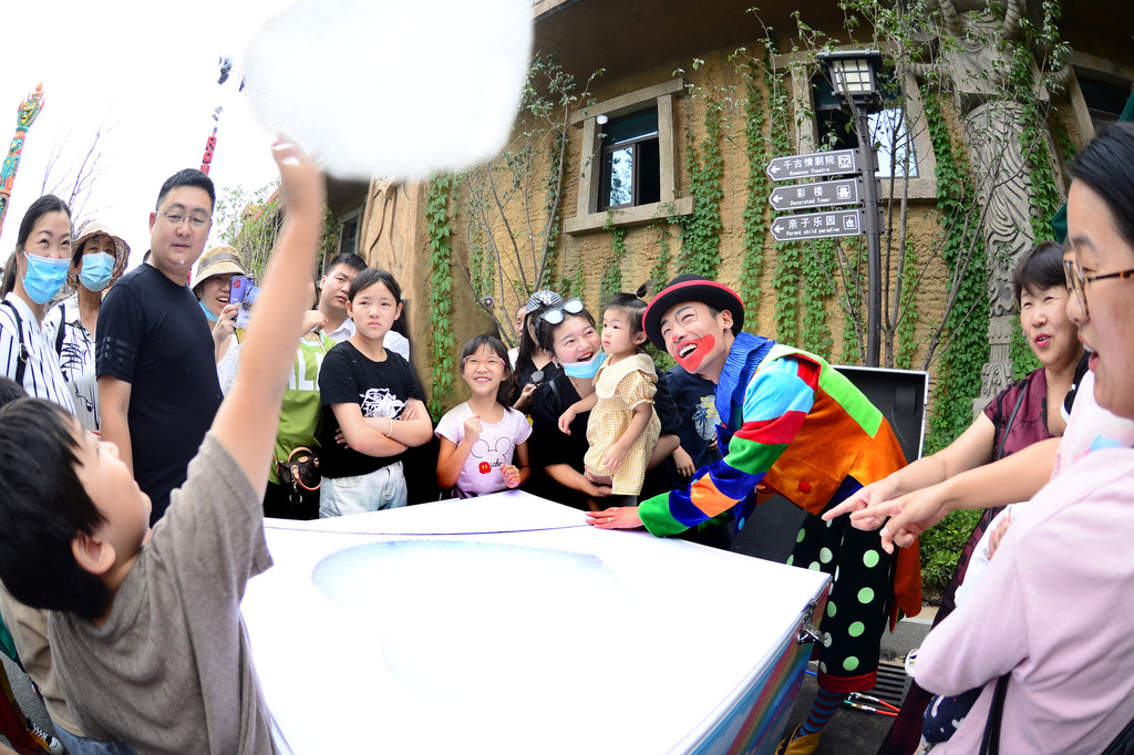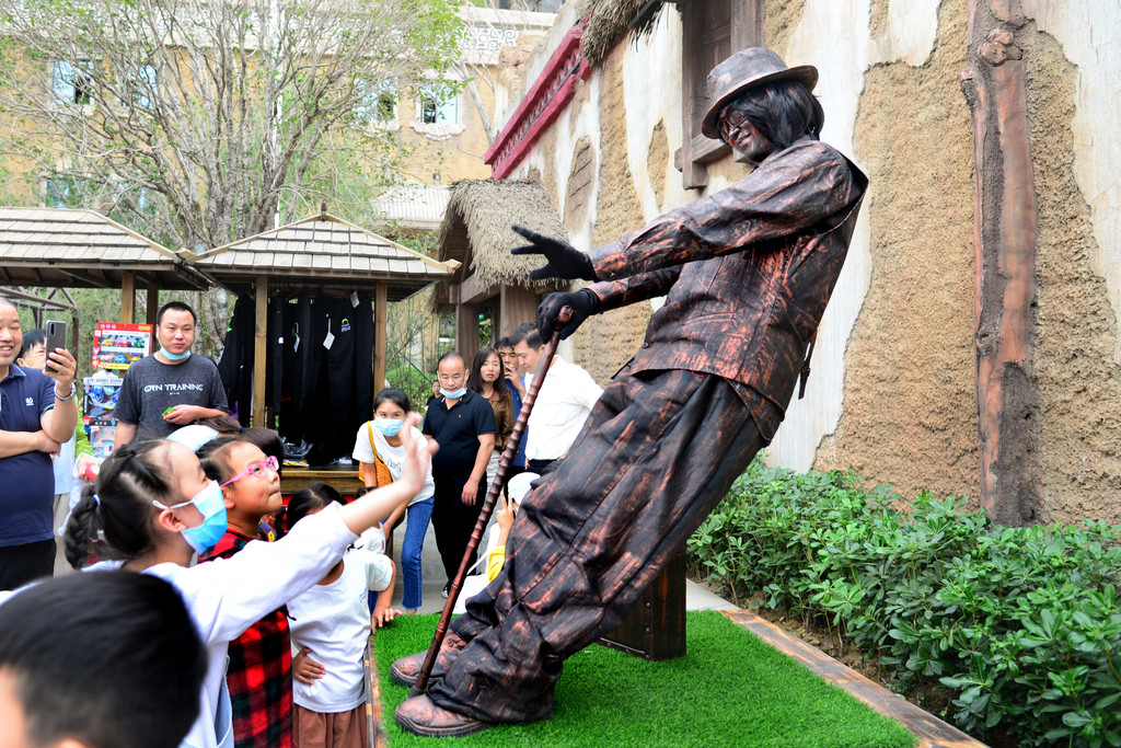 “消失的重力”、 “纸片人”、“在路上”都是景区内的行为艺术表演,这些演员很辛苦,表演时间要一动不动。孩子们亲切的微笑和招呼、观众的一个小小的“比心”,都是对他们的鼓励、感谢和赞叹。