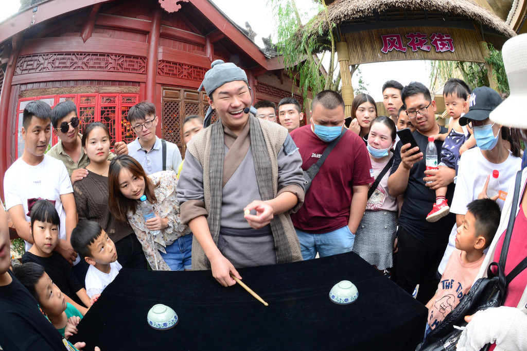 戏法演员带着狡黠的笑容在风花街头表演《三仙出洞》,这样近距离的在观众面前“瞒天过海”可不容易啊,除了要手快眼快以外,还要时刻提防着小朋友“拆穿”。