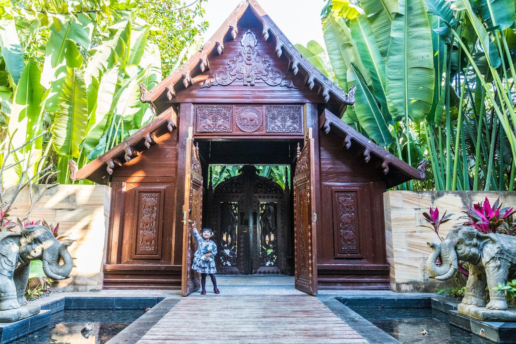 房间主题风格从户外门上孔雀或者大象的把手便能大概知悉屋内主要的风格。客房两处大门的布置,更有庭院深深的感觉。酒店所有的房间都带独立泳池。这是酷爱游泳的人最大的福音。凉亭、花园、闲适发呆。
