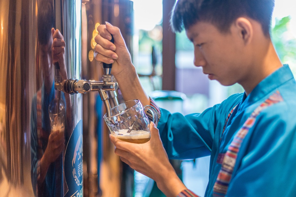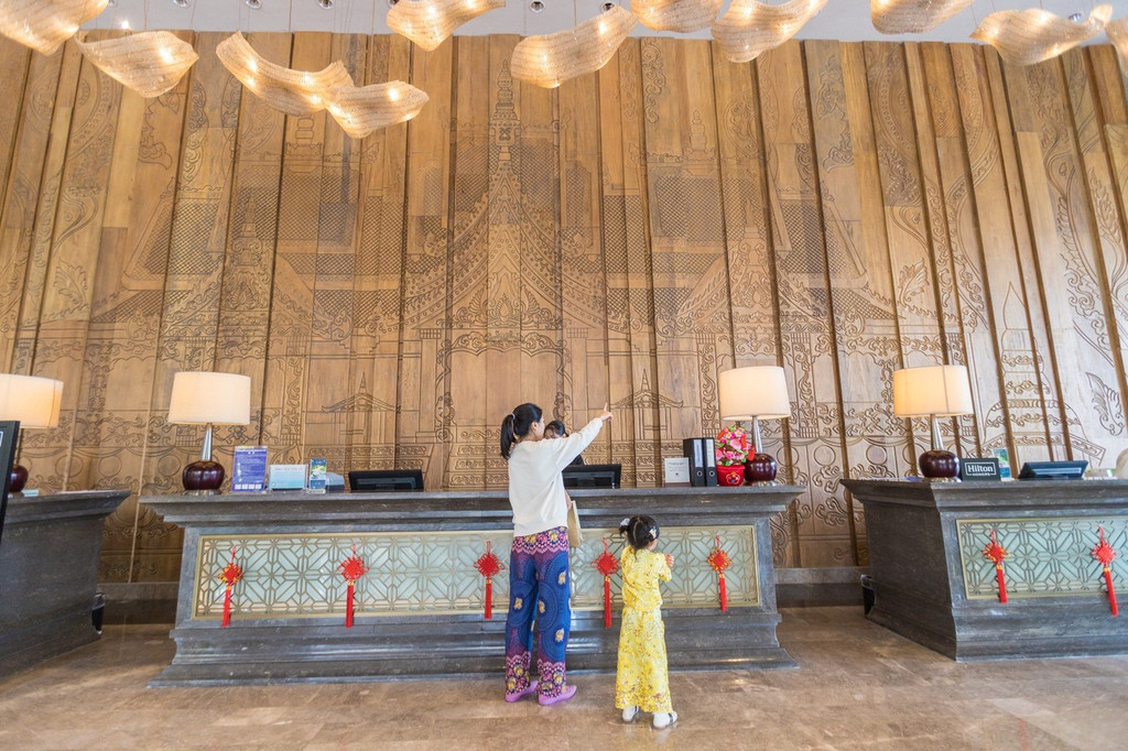 逸林的佛教元素和民俗风,相对而言就没那么浓厚,毕竟是年轻路线,只是前台后方的背景墙,用版纳总佛寺的木雕壁画,展现当地人民对佛教的信仰文化。大堂吧正中间的吊脚楼造型的吧台,传统的木工镶嵌而成,从酒店庭院中看过去,更像是微缩版的大堂,彼此互相呼应也不失为又一亮点。