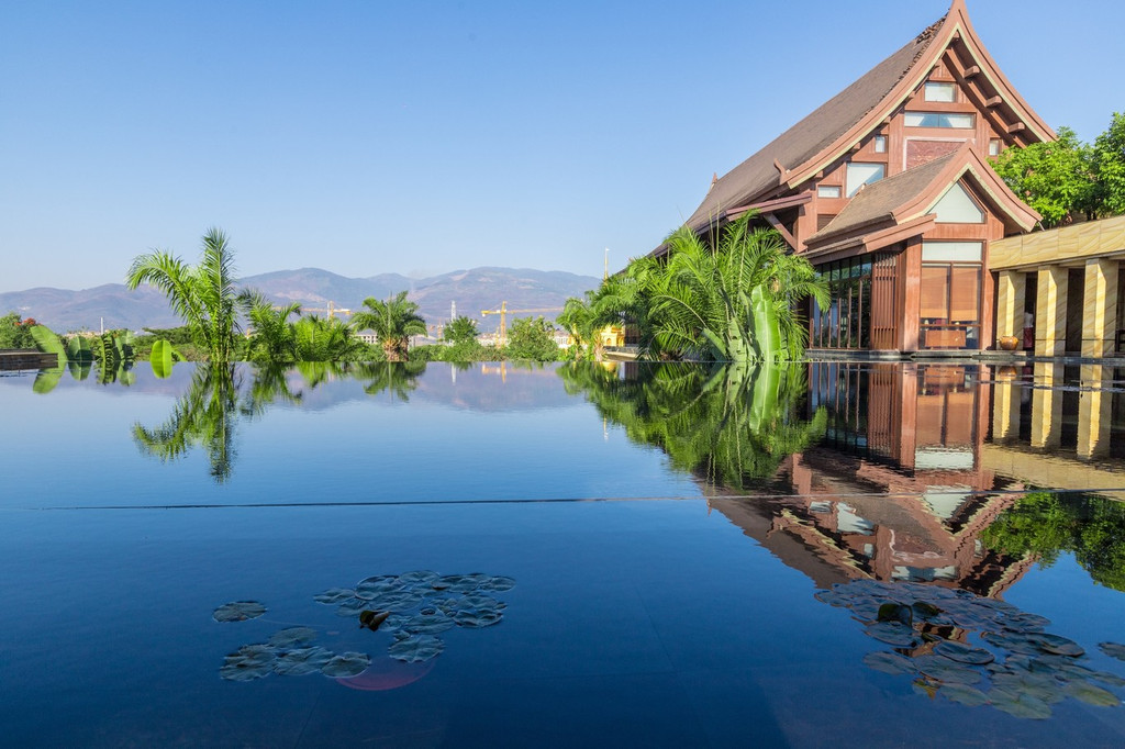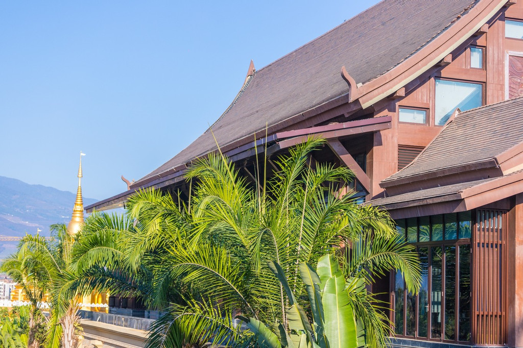 傣族文化,100个西双版纳的酒店就有100种解读,万达文华入户用吊脚楼造型的回廊,莲花的火盆盛开在水池中,少数民族的热情在佛教禅意中点燃,是酒店对傣族水文化、佛教文化重要解读,平台水景中的睡莲,倒影下的建筑和不远处大金塔无不是向当地南传佛教的致敬。酒店所有的建筑顶部都沿用当地房屋特点,斜顶,弯曲的飞檐直指蓝天。