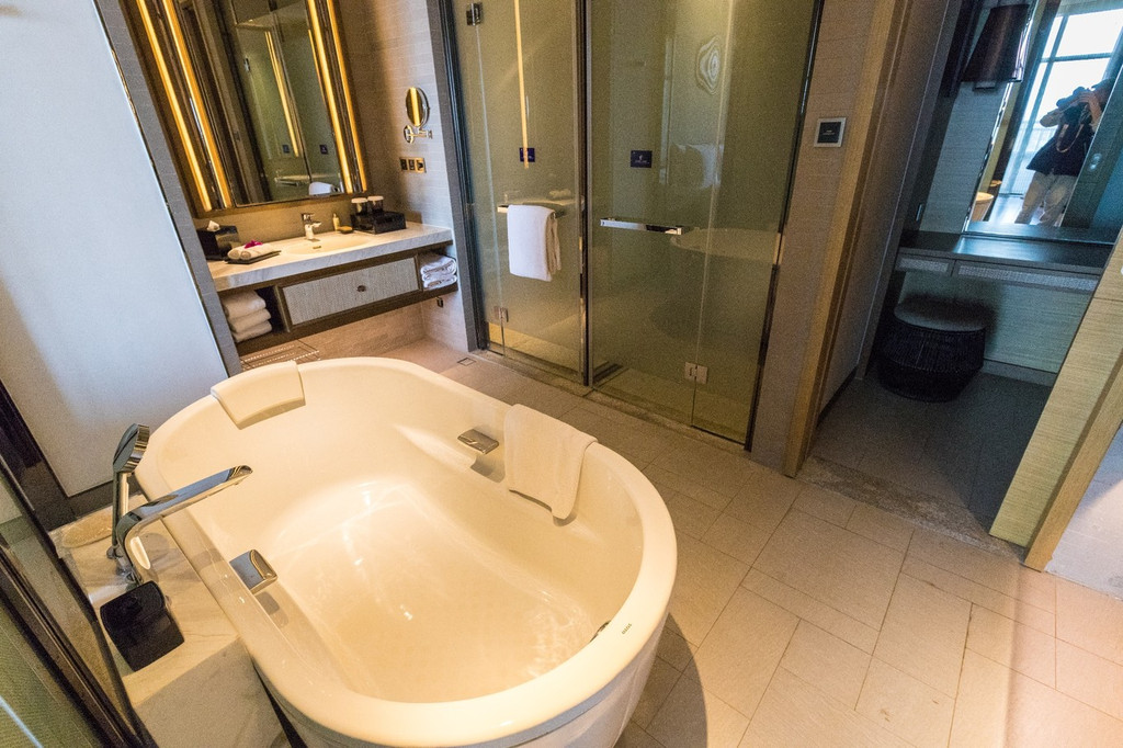 半开放式的浴室,通过移门和卧室区分开来,却紧密相连,无形中扩大了整个房间的面积,民俗风景图案、中式挑灯、藤编的床靠让客房更有度假的感觉。从假日到皇冠品牌的升级,除了硬件上的改造,细节装饰、备品以及各种logo已经悄然全部更换,仿佛从一开始就是为皇冠设定。