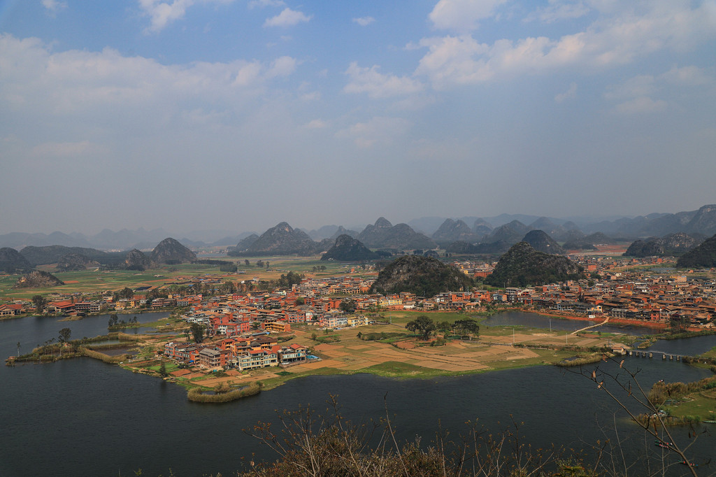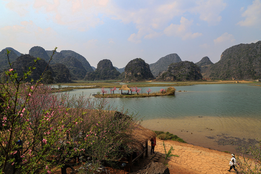 第十三天3月10日 我们停车的地方是仙人洞村。村里全是民宿、饭店和小商店,有点像丽江古城,只是小很多。仙人洞没开放,景区不要票,交通车和船票每人200元。昨天 下午大概逛了仙人洞村,今天的行程是三生三世十里桃花的拍摄地和青龙山看日落。就想着闲逛一下,等下午租电瓶车去青龙山等景点。它们都在普者黑村附近,结果逛着逛着,好像是走的去普者黑村的路,查了导航还真是的,就干脆走着去吧,大概3.8公里。好在相机是带着的,没带着三脚架,拍日落会受点影响。也没带着登山仗和护腰(我腰椎做过手术)。一路走一路拍,也没觉得累,比起万峰林那八公里近多了。