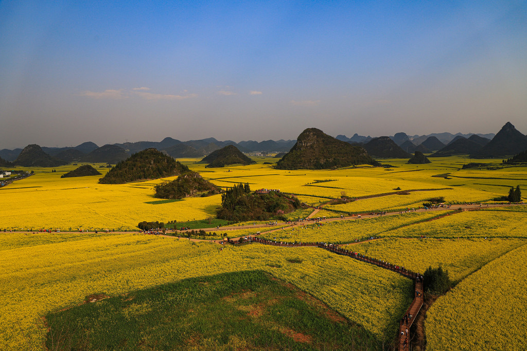 在螺丝田的时候天还阴着,到马街天就放晴了。趁着天好,抓紧往金鸡峰丛赶,景点门票17元,今天是三八妇女节,对女士免门票。金鸡峰丛的景色和万峰林比较像,只是游客离花海更近些,有两个观景台。可以从高处观看花海和山峰的完美结合。今天运气不错,到了五点多,云层淡了不少,估计能看到落日,就一直在观景台上耐心等待,到六点多钟终于等到了落日余晖。 晚上, 我们就住在了景区对面的停车场,是高速金鸡服务区工作人员停车场,又有卫生间又有热水,很是舒服。看看明天早上能不能有运气看道日出。第十二天3月9日今天出发去普者黑,早上起来有雾,日出是没有希望了,从这里去普者黑只有一条山路。弯道很多大约需要四十分钟。没想到一进盘山路雾气就严重了很多,能见度不足五米。也就是早上,如果是傍晚的话,就不敢走了。大概到了十点多,雾气渐渐散开,当时路上车不多,我家司机有点放飞自我,在弯道上车速越跑越快,一个急弯车子甩尾了,仗着老头的驾驶技术不错,险险控制住了,吓得我心惊胆战,路的两边都是悬崖,太危险了。一路看好司机控制好车速,大概十一点钟开到了山顶,没想到山头上还有一个活牛活猪的买卖市场,拉牲畜的车就停在路边,剛说这样太危险了,一共双车道还占道停车,,没成想拐过弯就堵住了。前面一辆旅行大巴,对向车道停着一辆大货车,车上没有司机,大巴车拐不过去,卡死在弯道上。雪上加霜的是正赶上赶集的日子,道路两边各种摊子,行人摩托都也堵得动弹不得。半个小时后警察到了,打电话找人,指挥开车,各种疏导,在堵了两个半小时后,终于开动了。看路边的标示是师宗县高良乡的大集。离开的时候,我家那位向站在车流中的警察同志表示感谢,两人亲切的握手告别,特别美好的画面,等我想拍照留念的时候,车已随着车流开动了,非常遗憾。