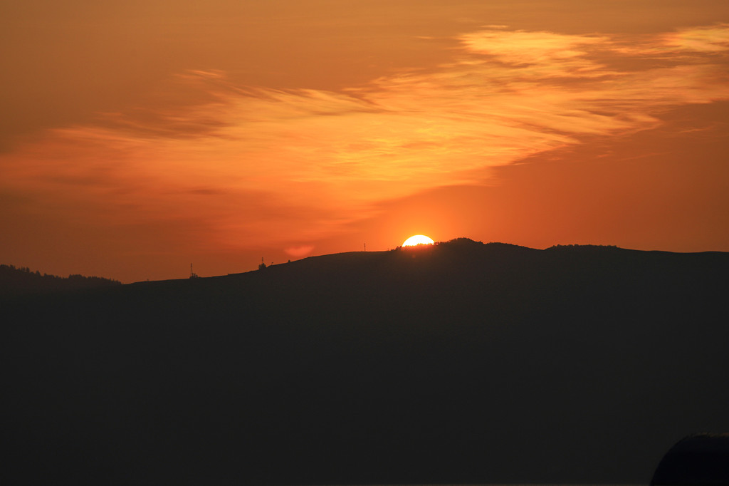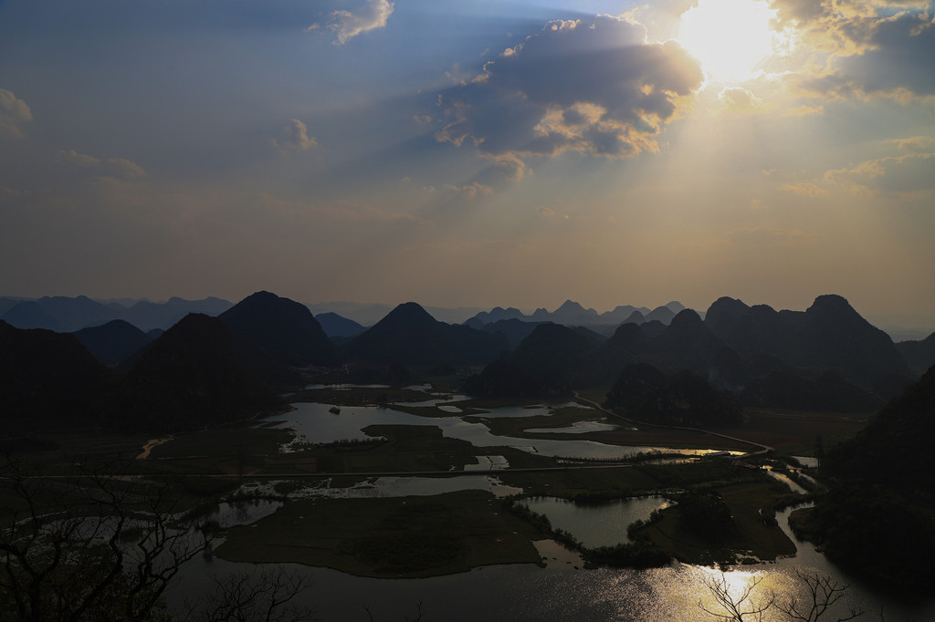出来不到七百米,就到了青龙山。感觉有些累不想爬山了,到山脚下看看不是太高,就爬吧,还想拍落日呢。终于爬到山顶,找好拍照的位置,时间还早,下午三点半左右,想先找个地方坐下,没想到意外发生,可能有点累了,一个踉跄人就扑倒在地,相机也摔了。疼得站都站不起来了,周围的游客帮忙把我扶起来,让出地方给我坐下。摔的有点狠,左肩疼的不敢动,右手擦伤严重,疼得我直掉泪。一个多小时后才缓和了些,老头想扶我下山,跟头都摔了,我怎么也得把落日拍了啦。明天早上肯定没法再爬上来拍日出了。坚持等到七点多,拍完落日下山,实在是走不动了,坐当地村民的三轮车,一人十元回到停车场。晚饭也没做,去村里喝的米线。