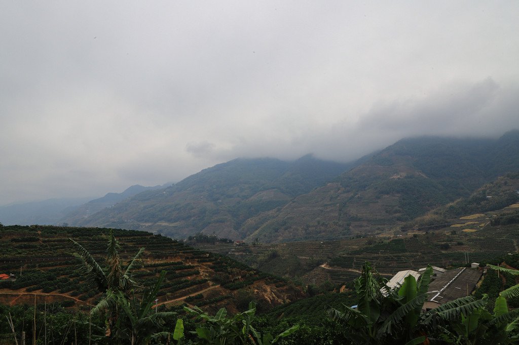 都中午十一点了,大雾还没散去,我们今天要去新平的磨盘山国家森林公园,大概路上要用时三个钟头。我家老头决定不等了,反正是往山下走慢慢开,可能雾也就散了。理想很丰满,现实是我们都挪了五十分钟了,能见度依然不到五米。都到了南恩瀑布了,瀑布的上游都看不到,水幕像是从云雾中冲出来的。等到我们从323国道转到090乡道去看哀牢山梯田时,终于走出了雾区。抬头看看哀牢山头仍然雨雾缭绕 , 哀牢山梯田大多种的是柑橘,和云阳水梯田不同。翠绿的果树在红梯田上排列整齐,特别好看。