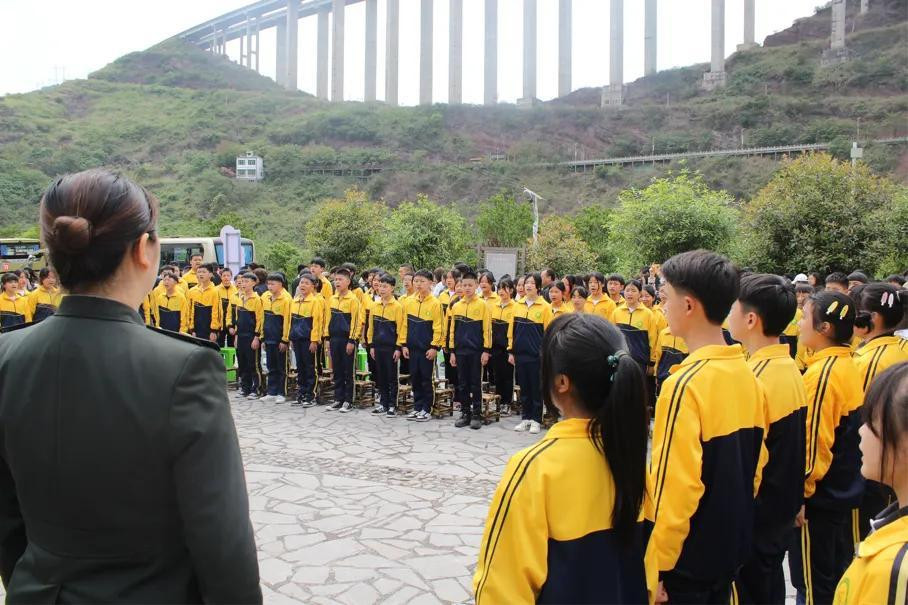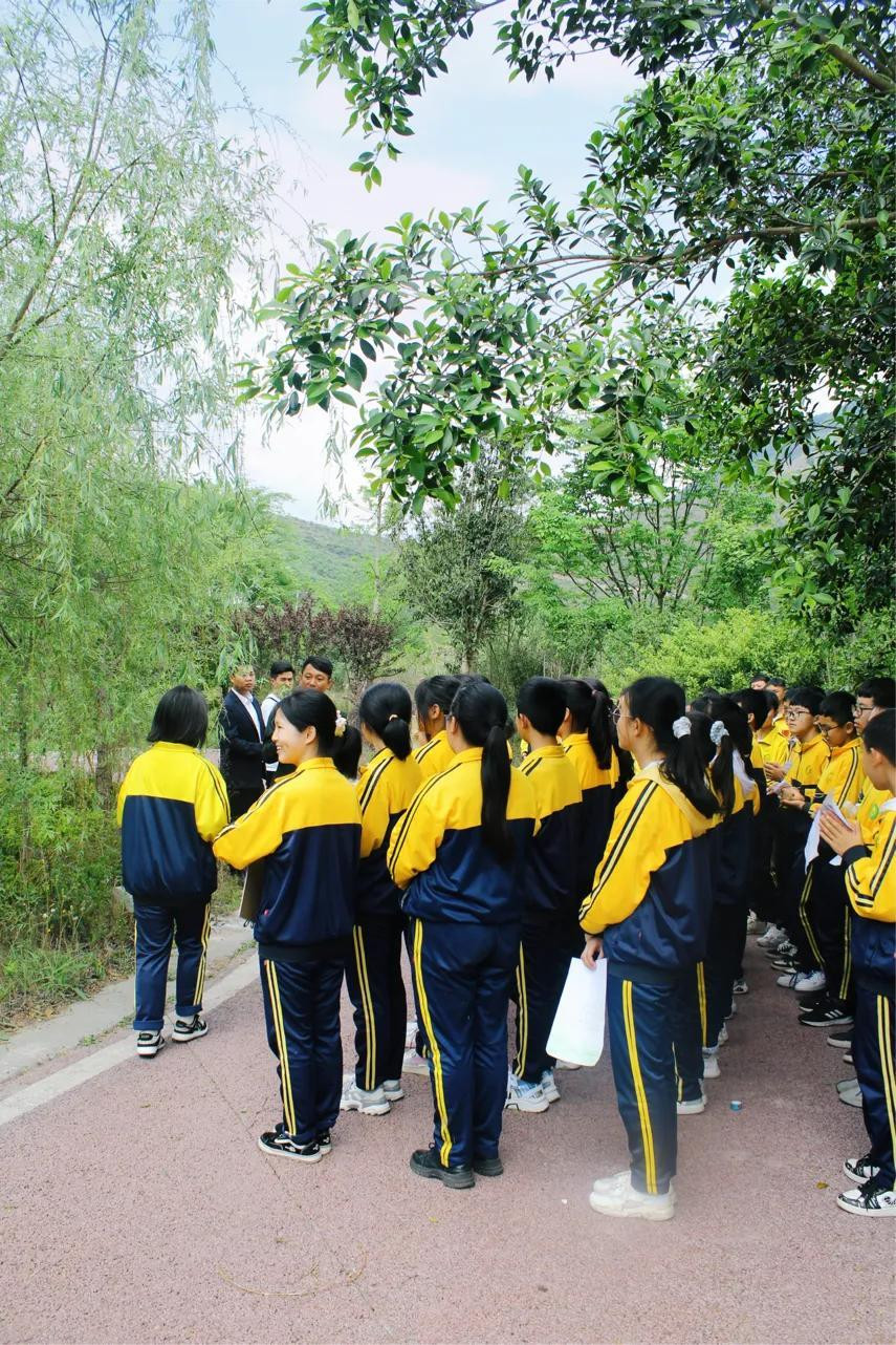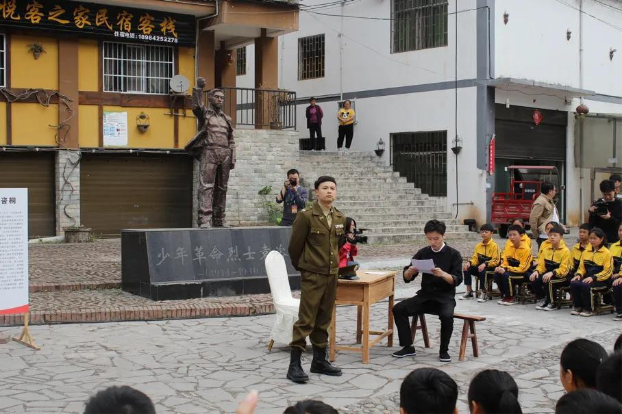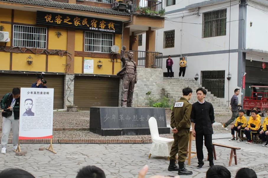 青杠坡战斗遗址,位于习水土城镇青杠坡村,是娄山系中呈东北——西南走向的白马山岭的一个陡坡。这一带地形历来是兵家必争之地。在1935年1月28日—29日,中央红军于此地与川军郭勋祺部进行了激烈的战斗,史称“青杠坡战斗”。在祭奠完毕后,坐着车去往了华润研学基地,在去的路上刚好遇到一个以革命烈士名字取名的袁咨桐广场,而且还有一段情景表演,表演完后,学生们一起唱红歌。