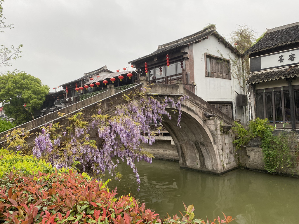 安境桥,立于胥塘之上,拱桥一跨就能跨到对岸的塘东街,作为一处网红打卡地,桥身布置了紫藤花树,此刻眼前一亮,桥上一小姐姐身着汉服款步而下,这不就是人们心目中的高中女生,一旁众人善解人意,留出走秀的空间,一阙汉宫调,一首陌上桑,瞬间感觉这才是人间西塘。