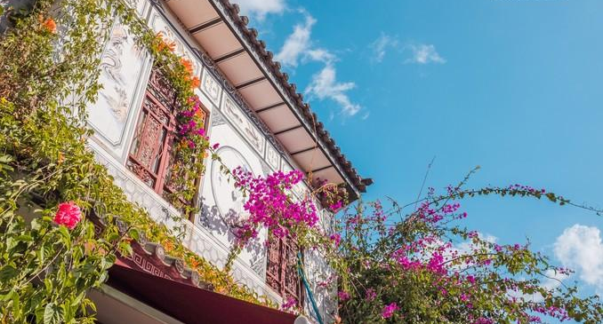 大理 历史悠久,是 云南 最早文化发祥地之一。悠久的历史也体现在古城独特的建筑特色。白族人养花爱花已成习惯,民居墙上的装饰也受此影响,图中的花朵绘在白色山墙上,显得清新雅致。除了绘画,当地人还常用白灰做出立体造型,精雕细刻吉祥图案。蓝天白云下成簇成簇的三角梅斜枝摇曳,总是在屋檐的角落,走入洱 海门 后,确实呈现给我们一个不一样的视野。