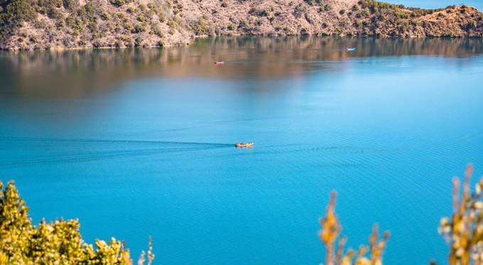 晴天的 泸沽湖 真的特别美,湖面上波光粼粼,湖水特别的蓝,水天一色,美得有点不真实。
