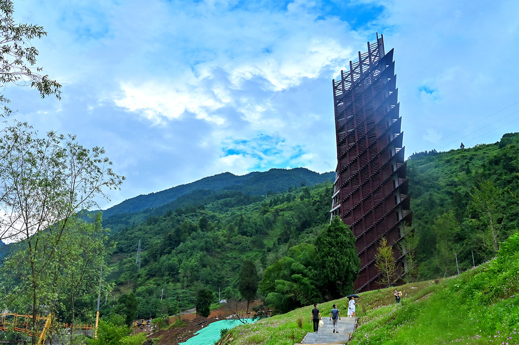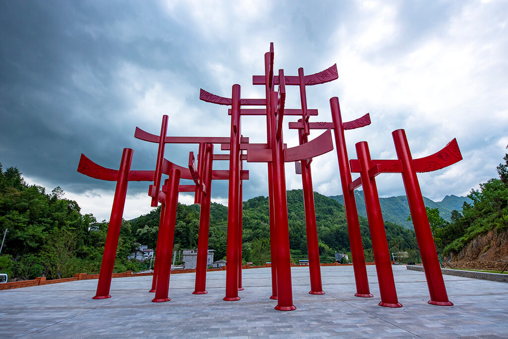 意匠神工雕塑,取“华夏意匠,鬼斧神工”之意,、由多名建筑大师和艺术家联袂打造,展现了土家匠人发明的干栏式吊脚楼“刀背梁”的力学原理和背后的数理逻辑,具有非常震撼的艺术效果。