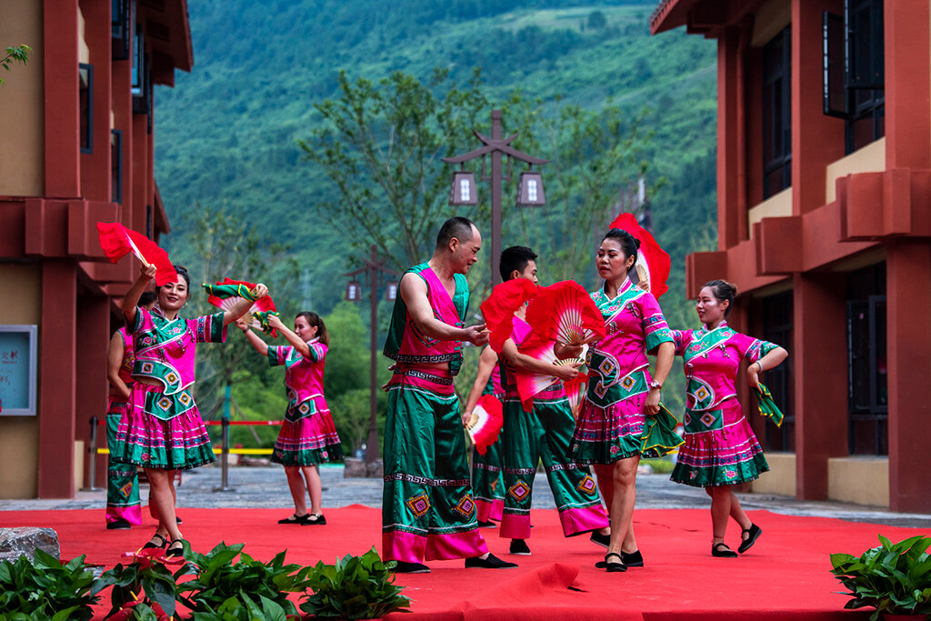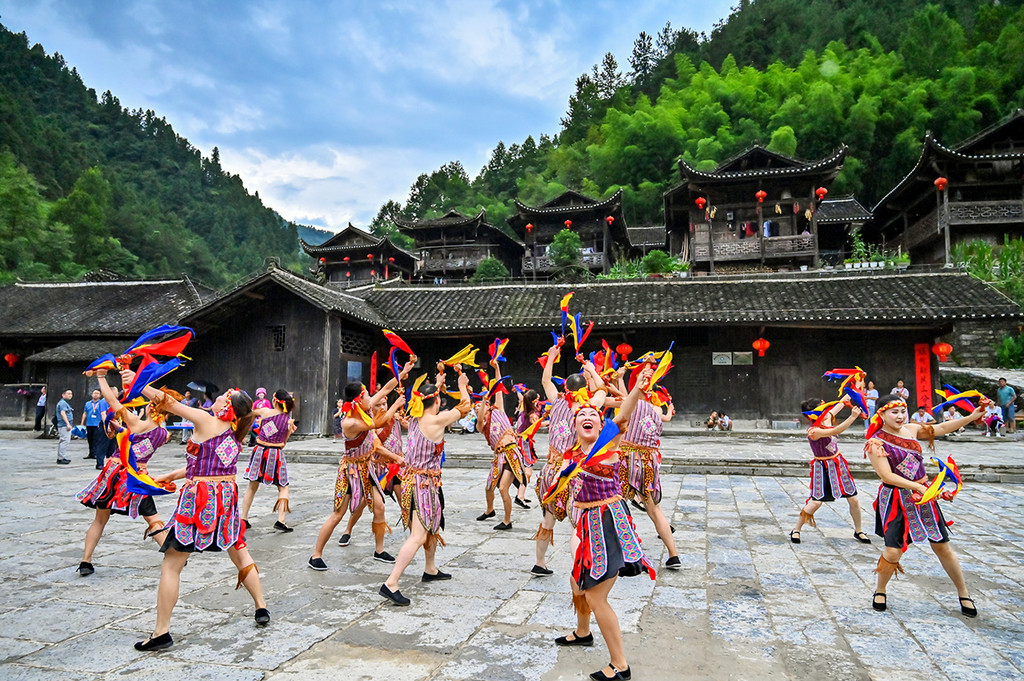 古朴的吊脚楼前,《八宝铜铃舞》等土家特色民间舞蹈非遗展演轮番登场。