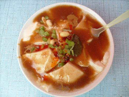 许昌热豆腐热豆腐是鄢陵县的传统特色小吃。用50公分见方的木斗子,将点好的豆腐脑用布单稍微一揽,使豆腐成块,软硬度以手托起不烂为准。售时用割豆腐刀将豆腐划成菱形小块儿放在豆腐皮上,浇上麻油、辣椒酱,用豆腐皮包起放在盘子里。热豆腐入口即化、鲜嫩可口,别有一番风味。