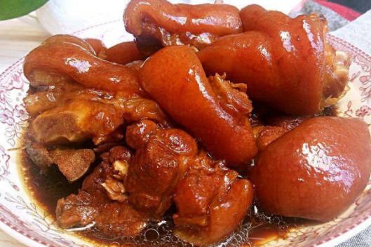 王洛红烧猪蹄制作工艺复杂,主要包括黄香粘毛、温水浴泡去浮沫、油炸、焖锅这四道工序,每道工序中又有着诸多不可忽视的细节处理工作,并且,仅配料就有草果、肉蔻、大小茴香、八角、白芷、花椒等20多种。经过如此繁琐复杂的工艺,制作出的猪蹄晶莹发亮,通体呈酱红色,肥而不腻,烂而不散,令人常吃不厌。