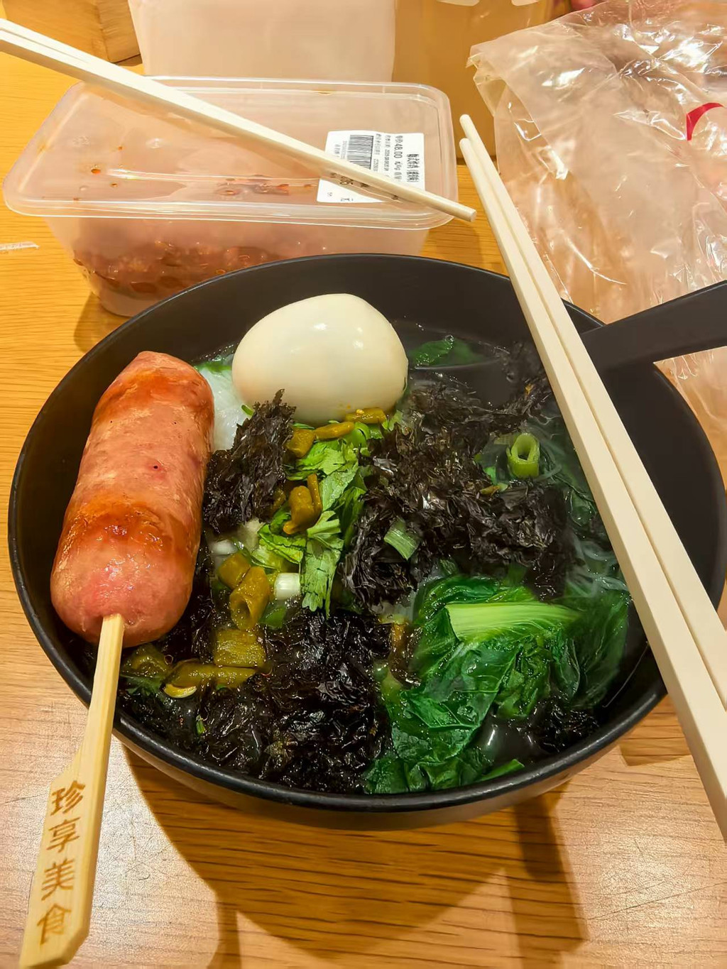 超市里面是走不动,走不动。甜点区的网红产品全空了。人太多,我挤到柜台前,买了火爆的韩式鸡块,甜粉肠,卤肠(包装好了,有时间),桃汁和芒果汁,一大瓶13元,真好,化妆品区选购了春娟黄芪霜。走了一圈,因为吃不了这么多食品,又不方便保管和带回,我控制了购物欲,9:30闭店前回到了全季,在4楼餐厅配着米线,吃得饱饱的。