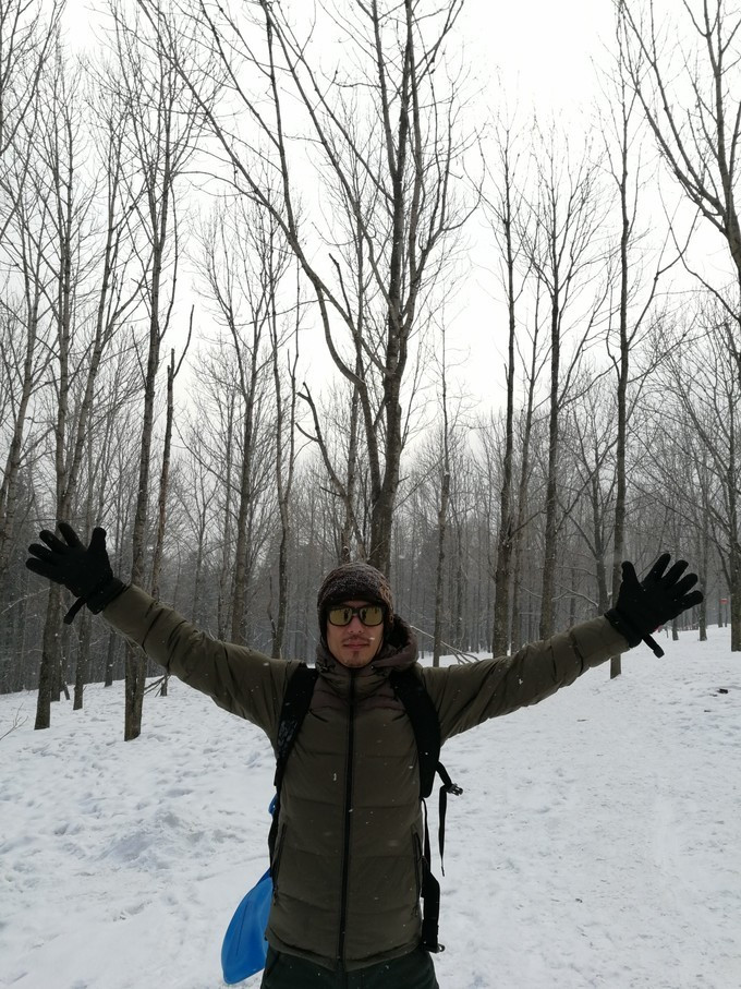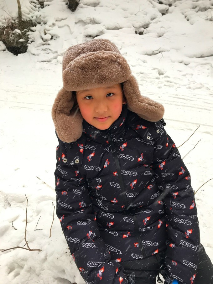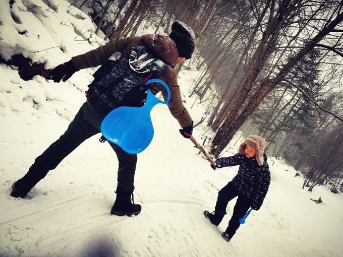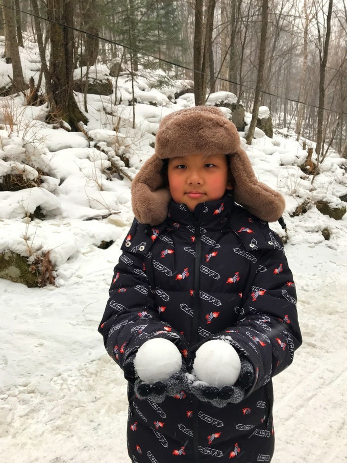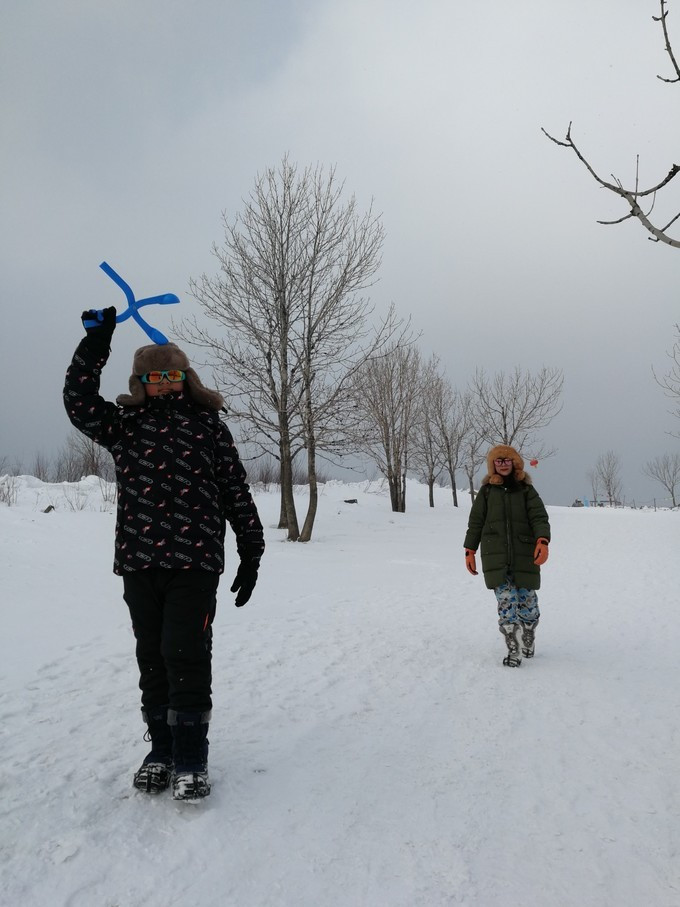 雪韵大街不长,大概10分钟不到,就可以走到往山河屯方向的巴士接驳站。接驳站下有一个儿童的滑雪场,叨叨拿着雪飘儿,滑了几次,感觉坡度不够,没有雪谷的刺激,随手做了几颗雪球。